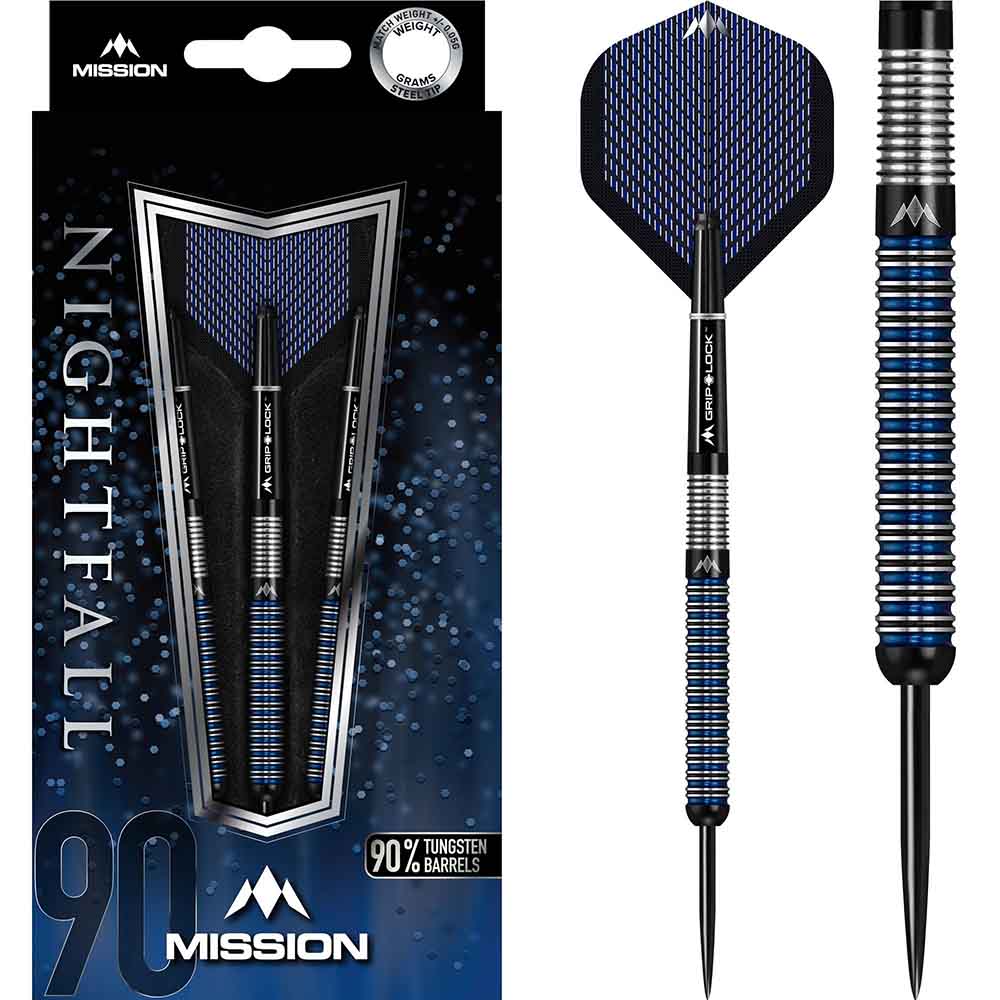 El juego de dardos se compone por 1 set de 3 cuerpos de dardos Mission con puntas de acero, 1 set de 3 cañas Mission y 1 set de 3 plumas Mission.