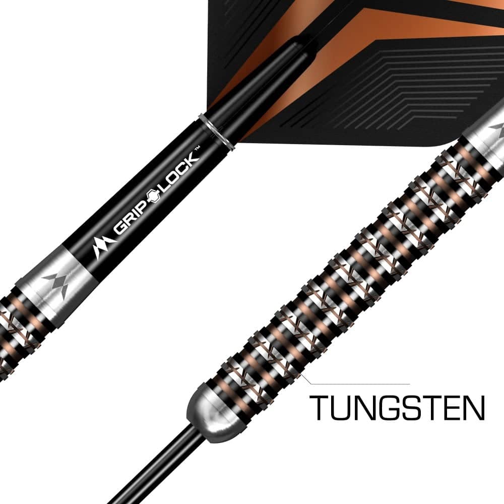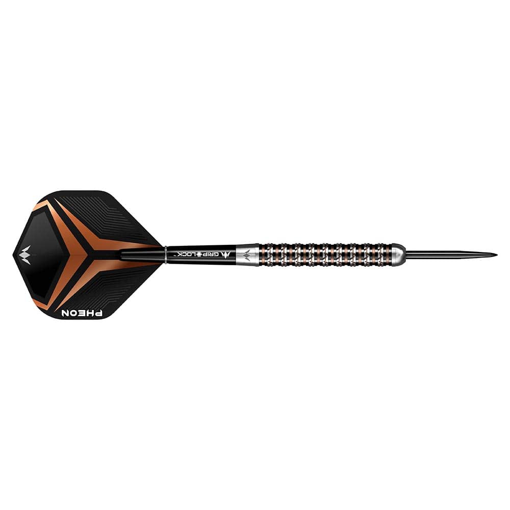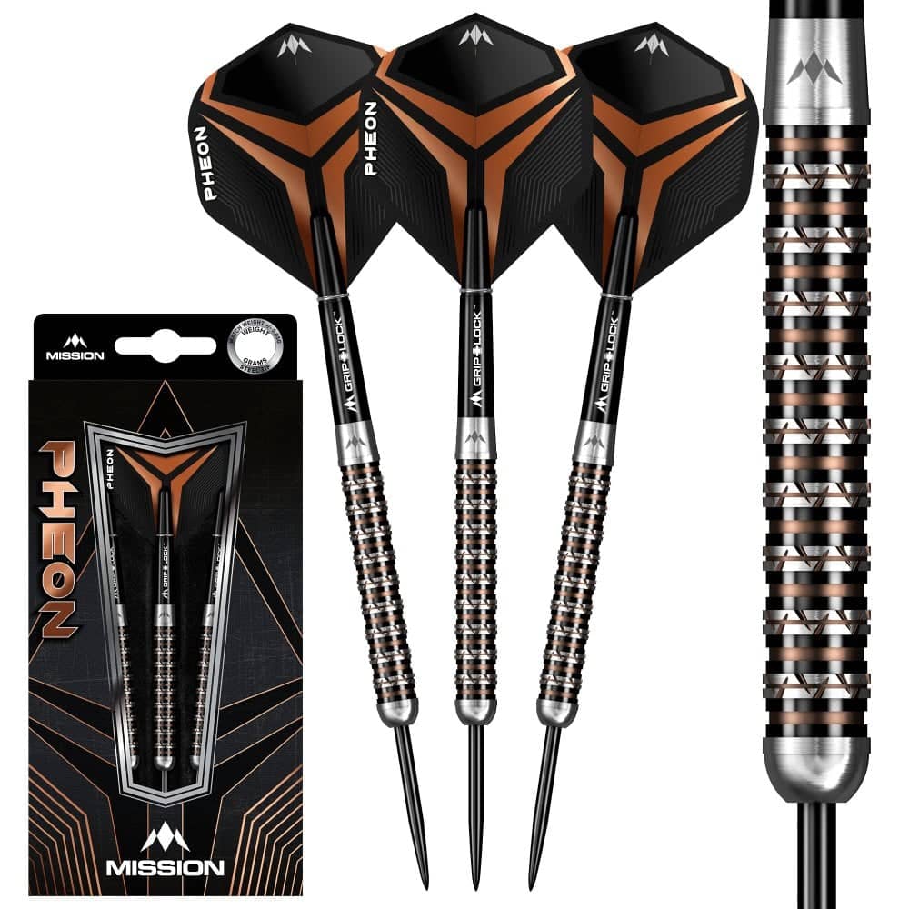 El juego de dardos se compone por 1 set de 3 cuerpos de dardos Mission Pheon con puntas de acero, 1 set de 3 cañas y 1 set de 3 plumas.