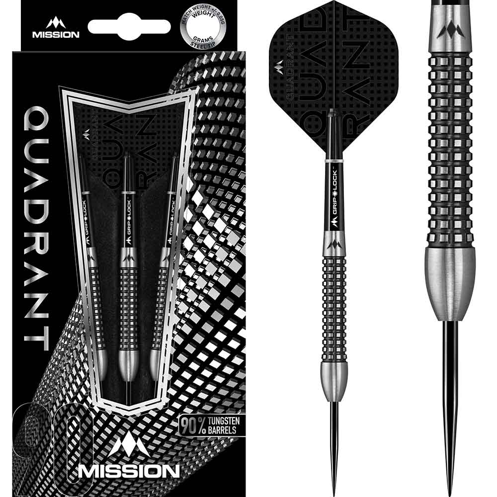 El juego de dardos se compone por 1 set de 3 cuerpos de dardos Mission con puntas de acero, 1 set de 3 cañas Mission y 1 set de 3 plumas Mission.