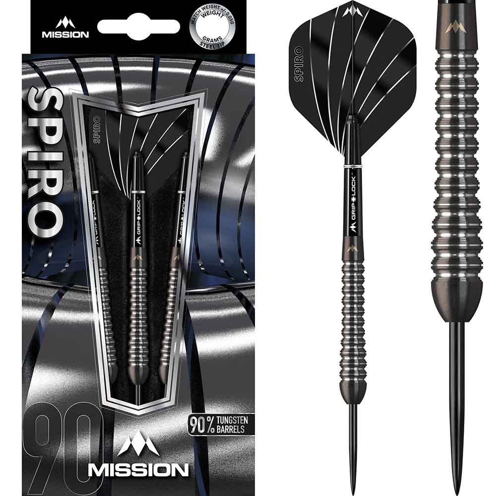 El juego de dardos se compone por 1 set de 3 cuerpos de dardos Mission con puntas de acero, 1 set de 3 cañas Mission y 1 set de 3 plumas Mission.