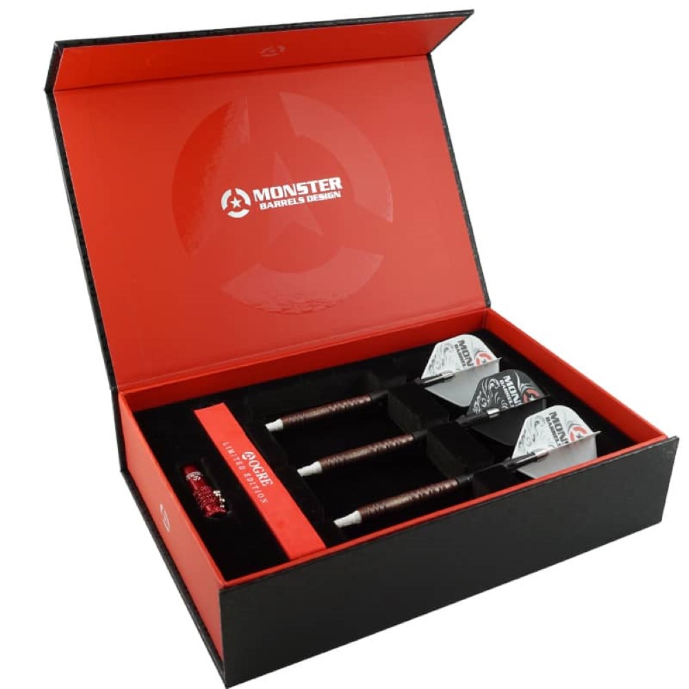 El juego se compone por 1 set de 3 cuerpos de dardos Monster Ogre II Limited Edition, 1 set de 3 cañas L-Shaft Carbon Lock 260, 1 set de 3 plumas Monster Original Flight Shape, 1 set de 3 puntas Lippoint Premium Blanca, 1 set de 3 copas Champagne premium color plata y 1 extractor de cañas y puntas rotas Monster Ogre rojo.