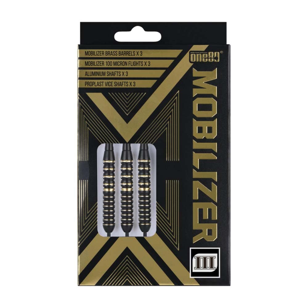 El producto se compone por 1 set de 3 cuerpos dardos One 80 Mobilizer , 1 set de 3 cañas One 80 Darts y 1 set de 3 plumas One 80 Darts