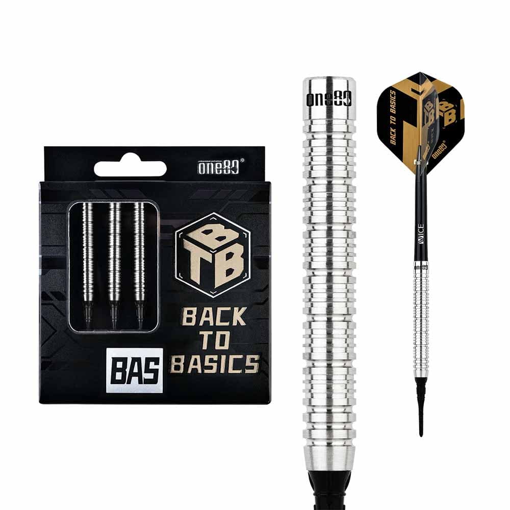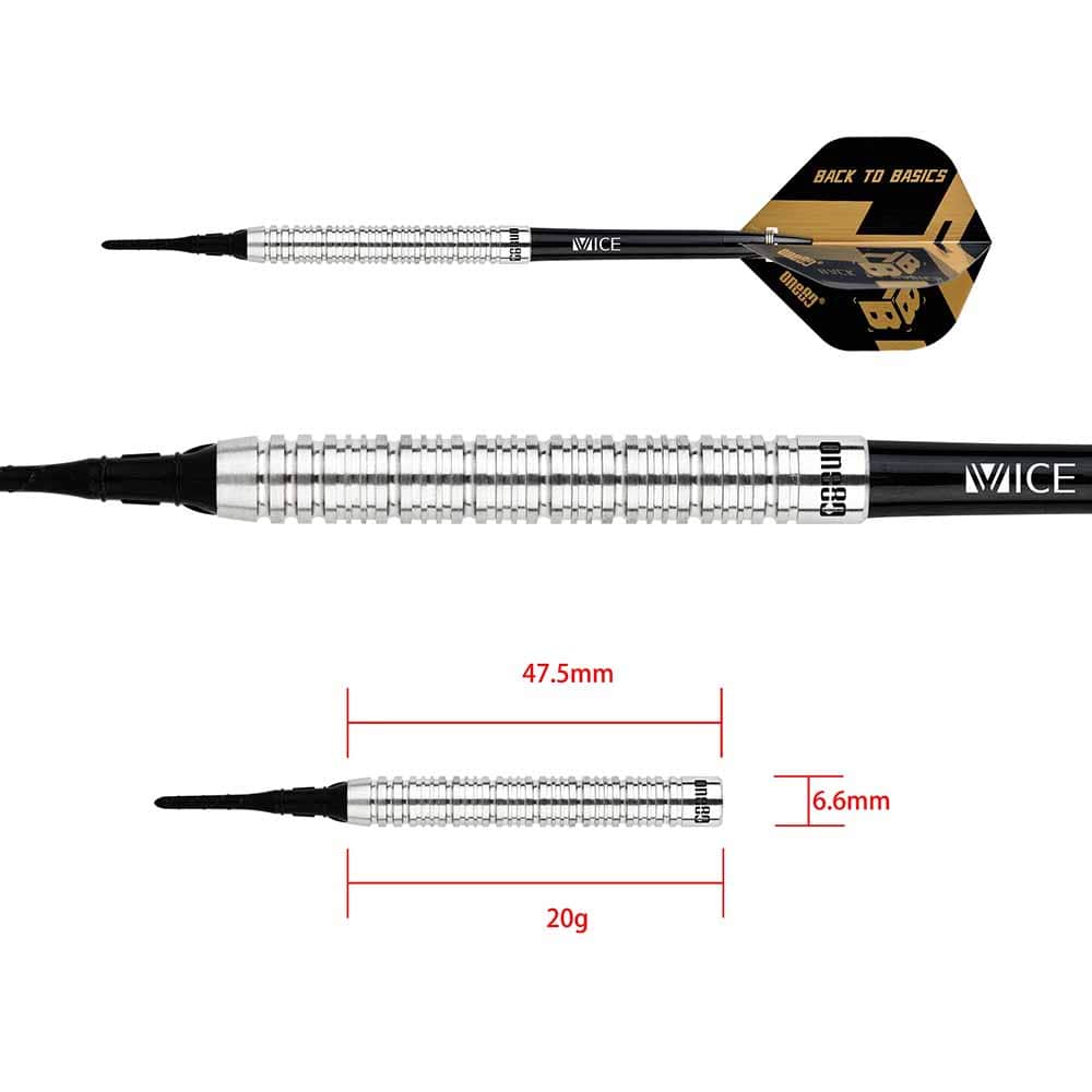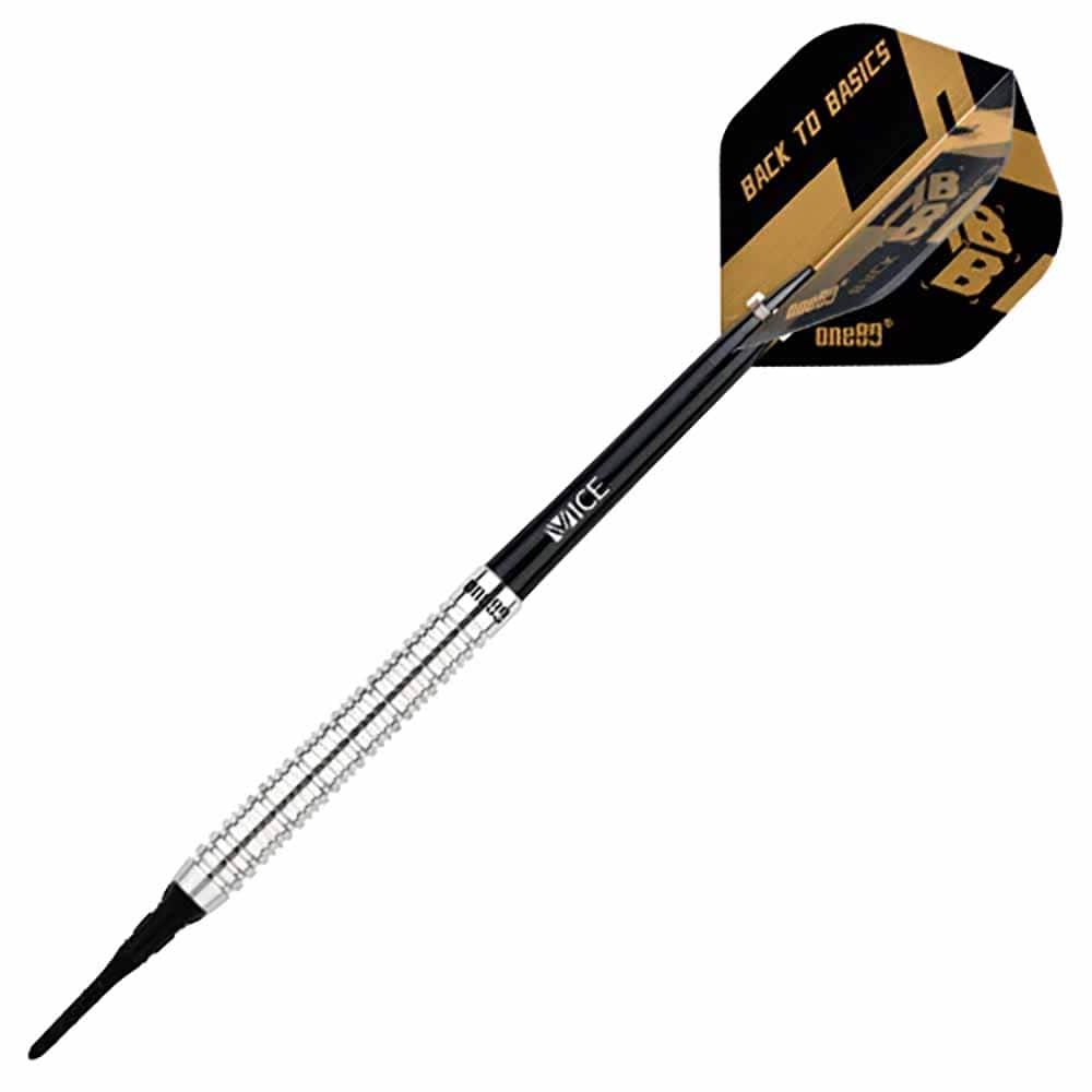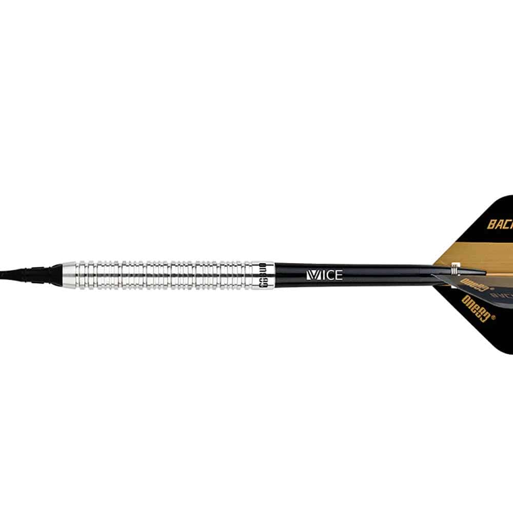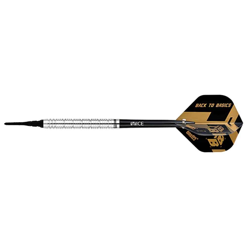 El juego de dardos Back To Basic se compone por 1 set de 3 cuerpos, 1 set de 3 cañas Vice, 1 set de 3 plumas y 1 set de 3 puntas 2ba.