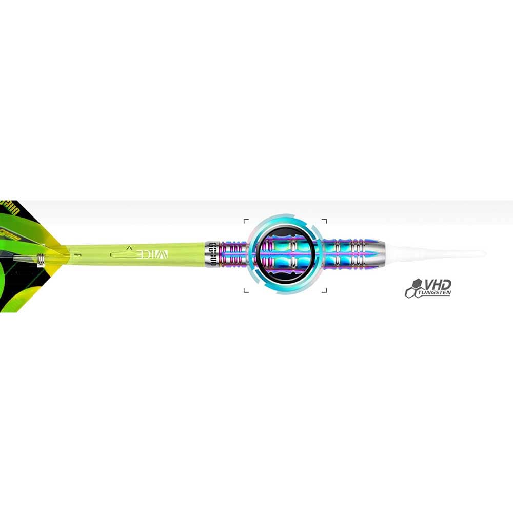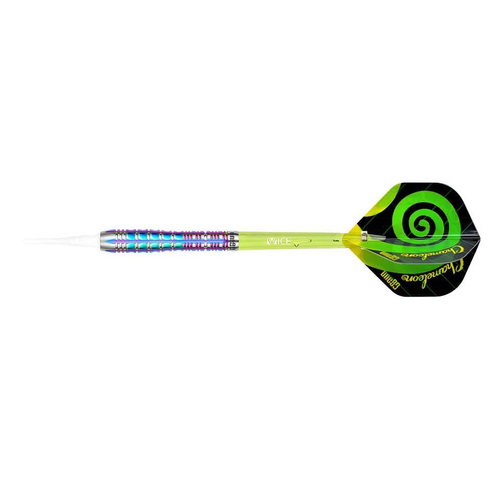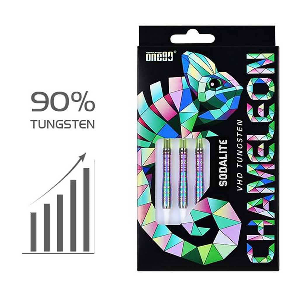 El juego de dardos Chameleon Sodalite se compone por 1 set de 3 cuerpos, 1 set de 3 cañas Vice, 1 set de 3 plumas y 1 set de 3 puntas 2ba.