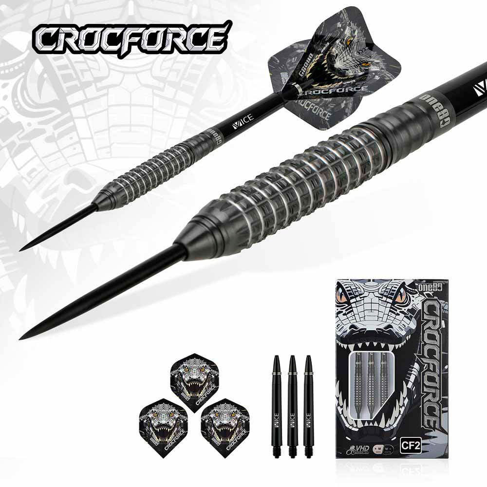 El juego de dardos Crocforce CF2 se compone por 1 set de 3 cuerpos, 1 set de 3 cañas y 1 set de 3 plumas.