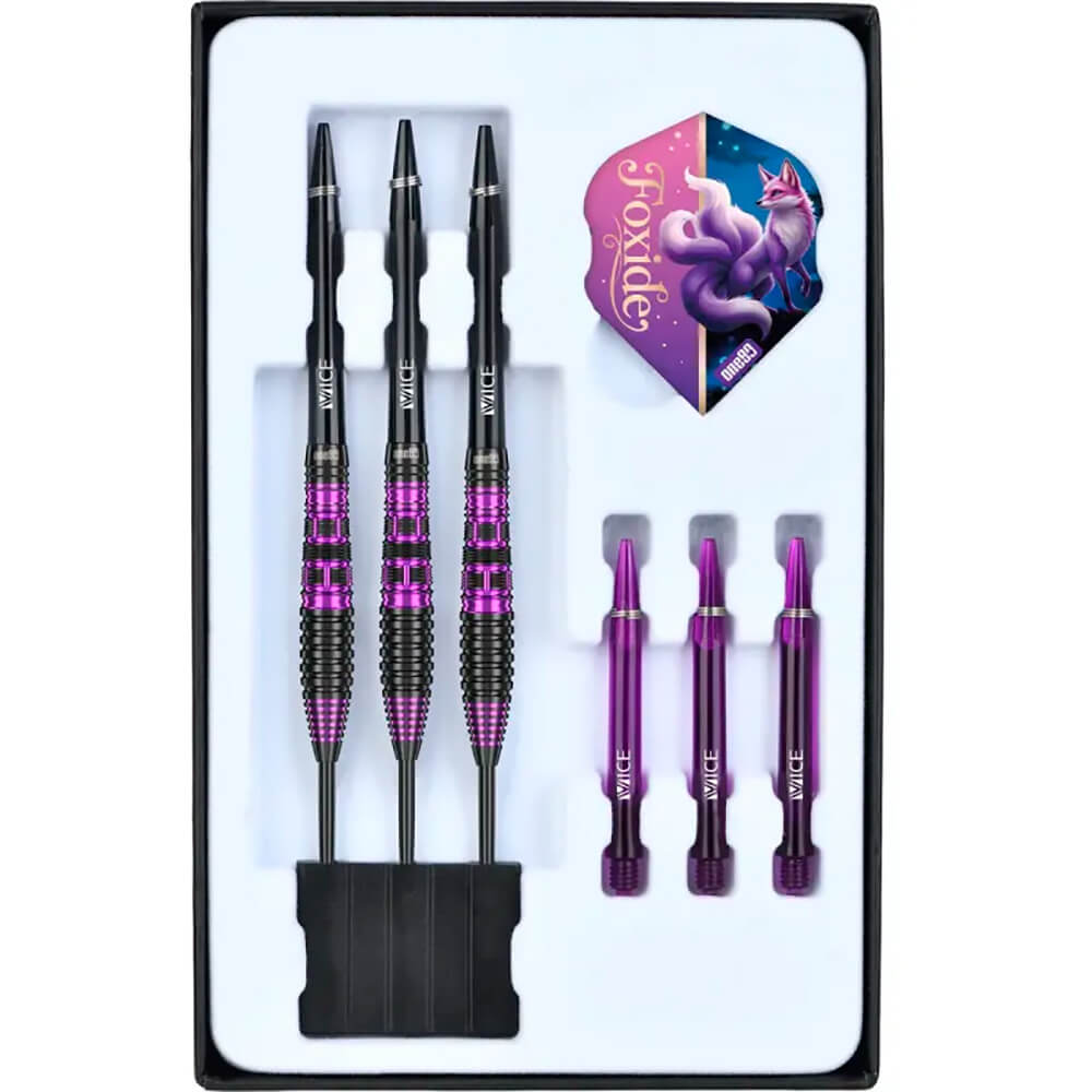 El juego de dardos Foxide F2 se compone por 1 set de 3 cuerpos, 1 set de 3 cañas y 1 set de 3 plumas