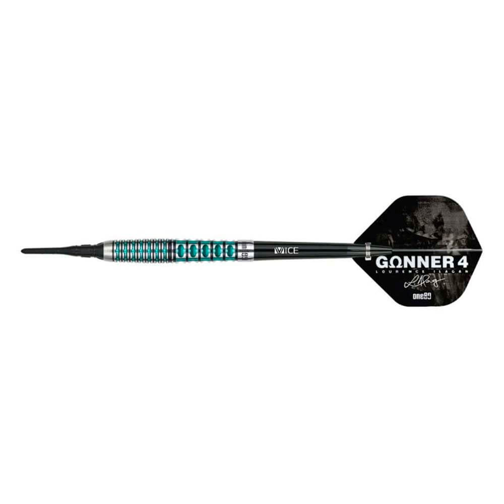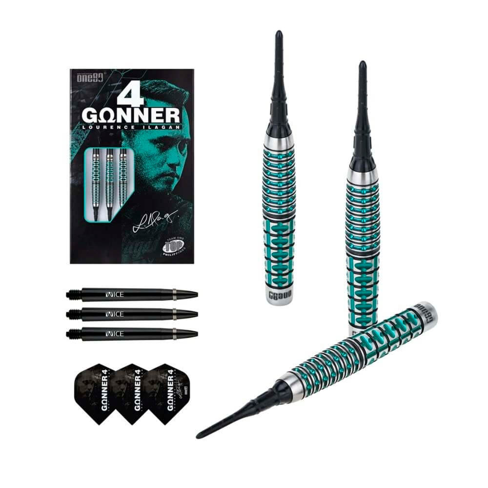 El juego de dardos One80 Gunner 4 Lourence Ilagan Black Jade se compone por 1 set de 3 cuerpos, 1 set de 3 cañas Vice, 1 set de 3 plumas y 3 puntas de plástico rosca 2ba 4mm.