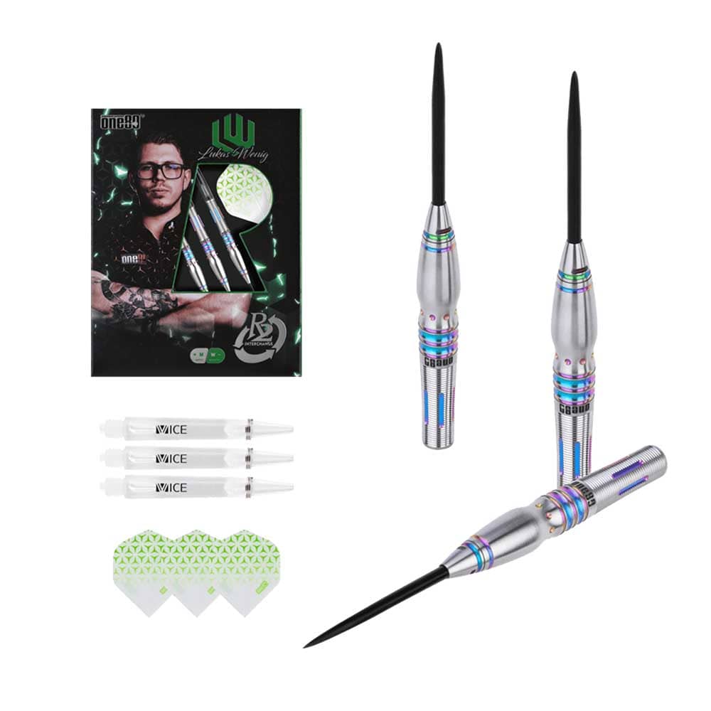 El juego de dardos One80 Lukas Wenig se compone por 1 set de 3 cuerpos, 1 set de 3 cañas, 1 set de 3 plumas y 3 puntas de acero R2