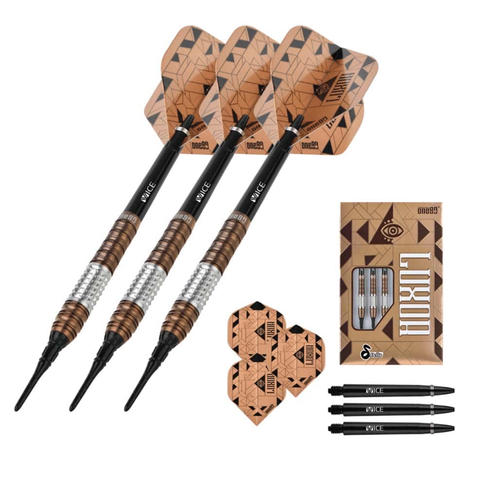 El juego de dardos Luxor Delta se compone por 1 set de 3 cuerpos, 1 set de 3 cañas , 1 set de 3 plumas y 1 set de 3 puntas 2ba.