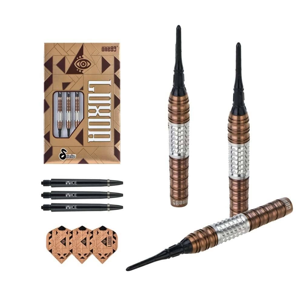 El juego de dardos Luxor Delta se compone por 1 set de 3 cuerpos, 1 set de 3 cañas , 1 set de 3 plumas y 1 set de 3 puntas 2ba.