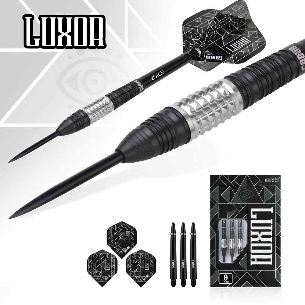 El juego de dardos Luxor Theta II se compone por 1 set de 3 cuerpos, 1 set de 3 cañas , 1 set de 3 plumas y 1 set de 3 puntas 2ba.