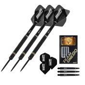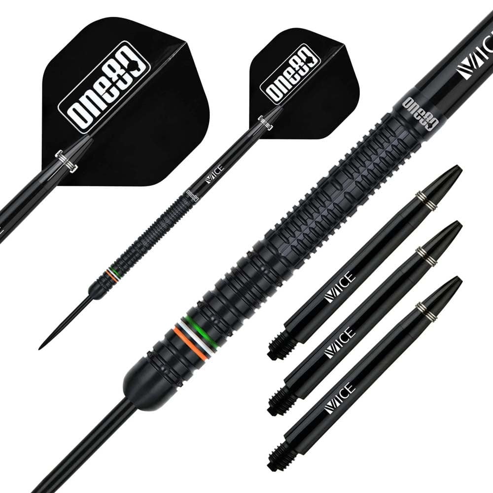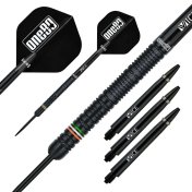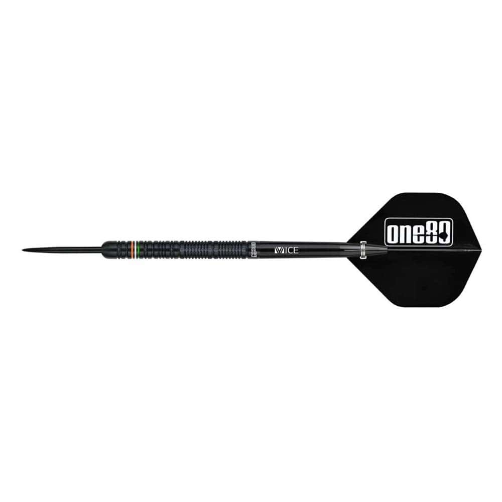 El juego de dardos One80 Mahi Bosmia se compone por 1 set de 3 cuerpos con punta de acero, 1 set de 3 cañas Vice y 1 set de 3 plumas.