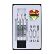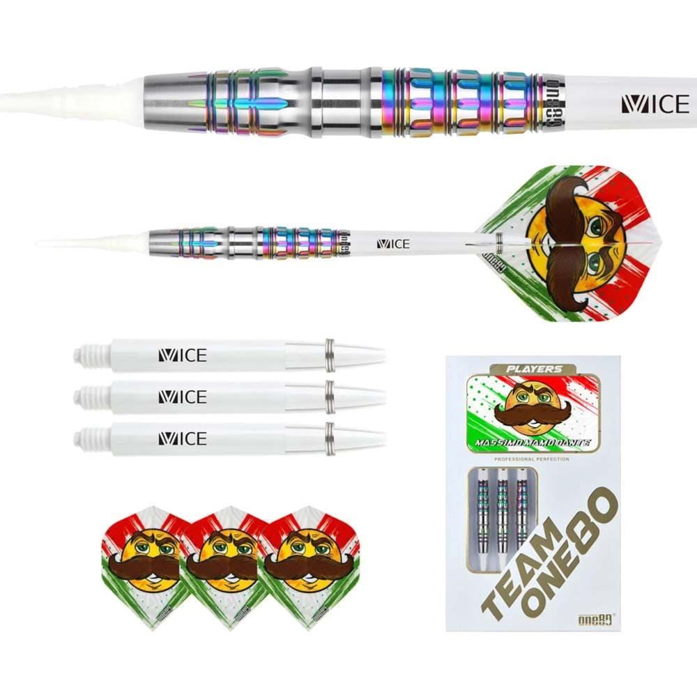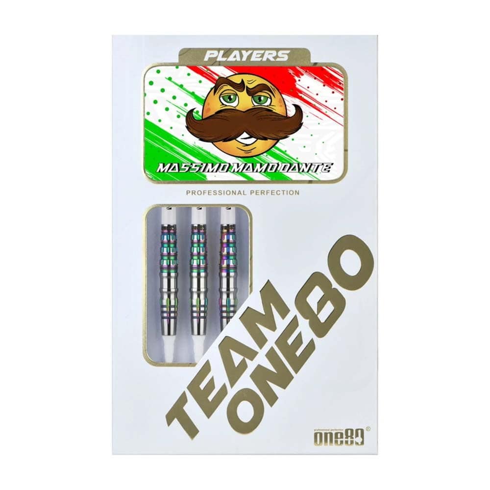 El juego de dardos One80 Mamo Massimo Dante se compone por 1 set de 3 cuerpos, 1 set de 3 cañas, 1 set de 3 plumas y 1 set de 3 puntas 2ba.