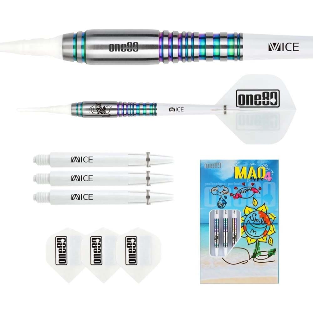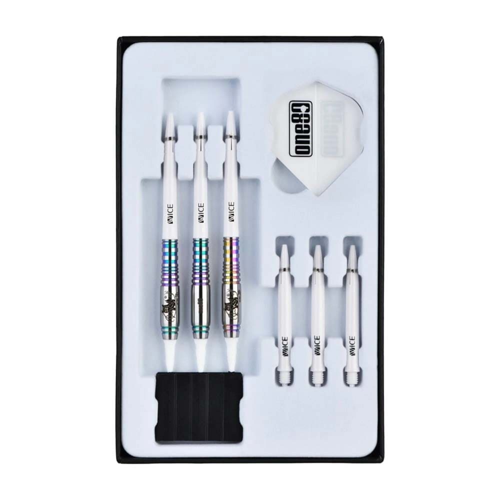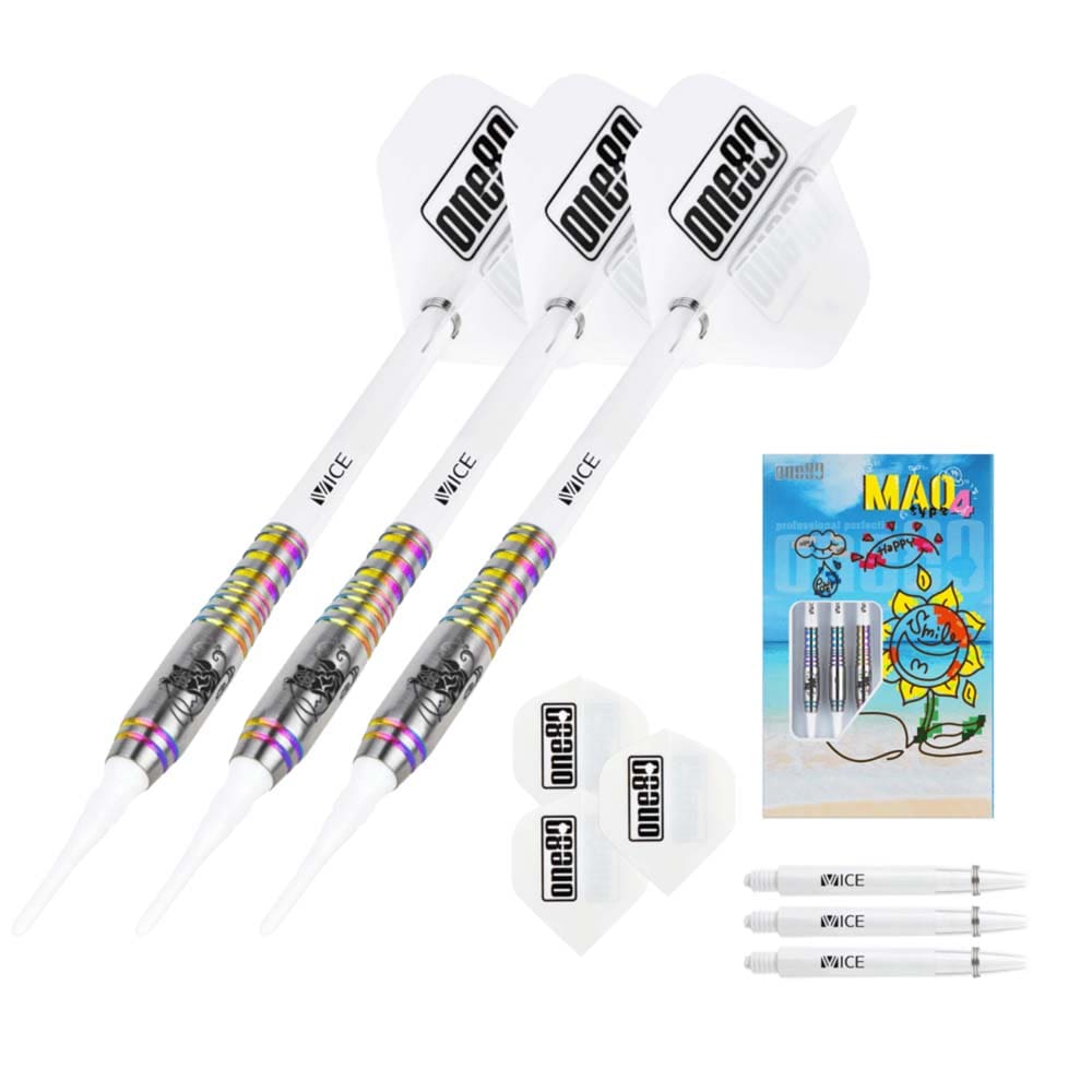 El juego de dardos One80 Mao Shimamura 4 Rainbowl se compone por 1 set de 3 cuerpos, 1 set de 3 cañas, 1 set de 3 plumas y 1 set de 3 puntas 2ba.