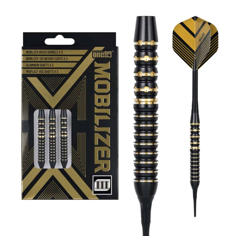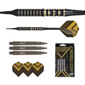 El juego de dardos Mobilizer se compone por 1 set de 3 cuerpos, 1 set de 3 cañas Vice, 1 set de 3 plumas y 1 set de 3 puntas 2ba.