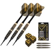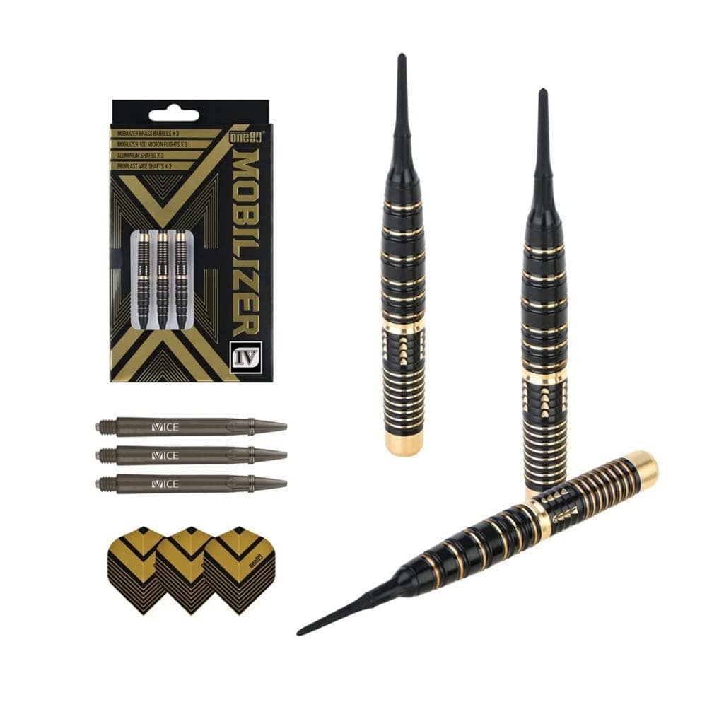 El juego de dardos Mobilizer se compone por 1 set de 3 cuerpos, 1 set de 3 cañas Vice, 1 set de 3 plumas y 1 set de 3 puntas 2ba.