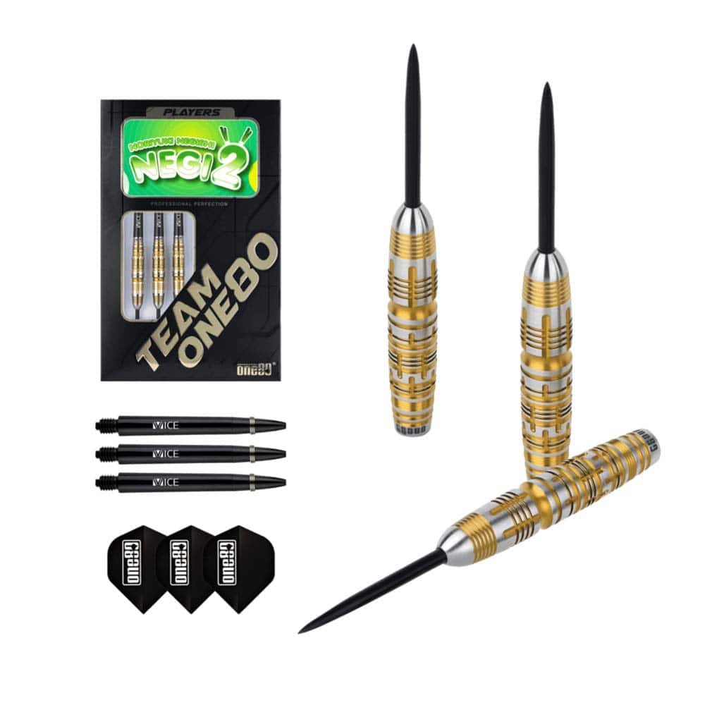 El juego de dardos Noriyuki Negishi Negi 2 se compone por 1 set de 3 cuerpos con punta de acero, 1 set de 3 cañas Vice y 1 set de 3 plumas.