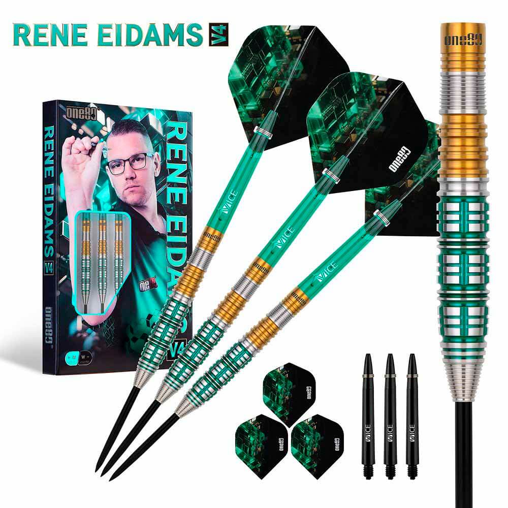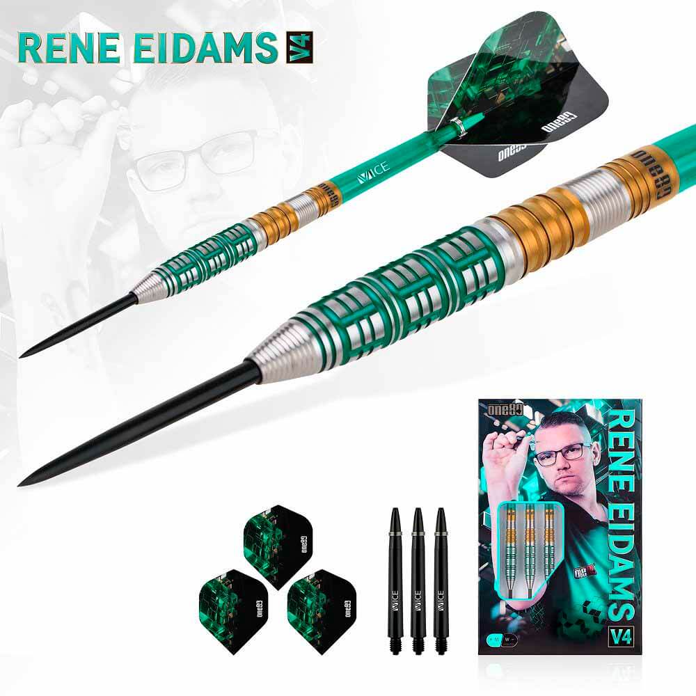 El juego de dardos Rene Eidams V4 se compone por 1 set de 3 cuerpos, 1 set de 3 cañas y 1 set de 3 plumas