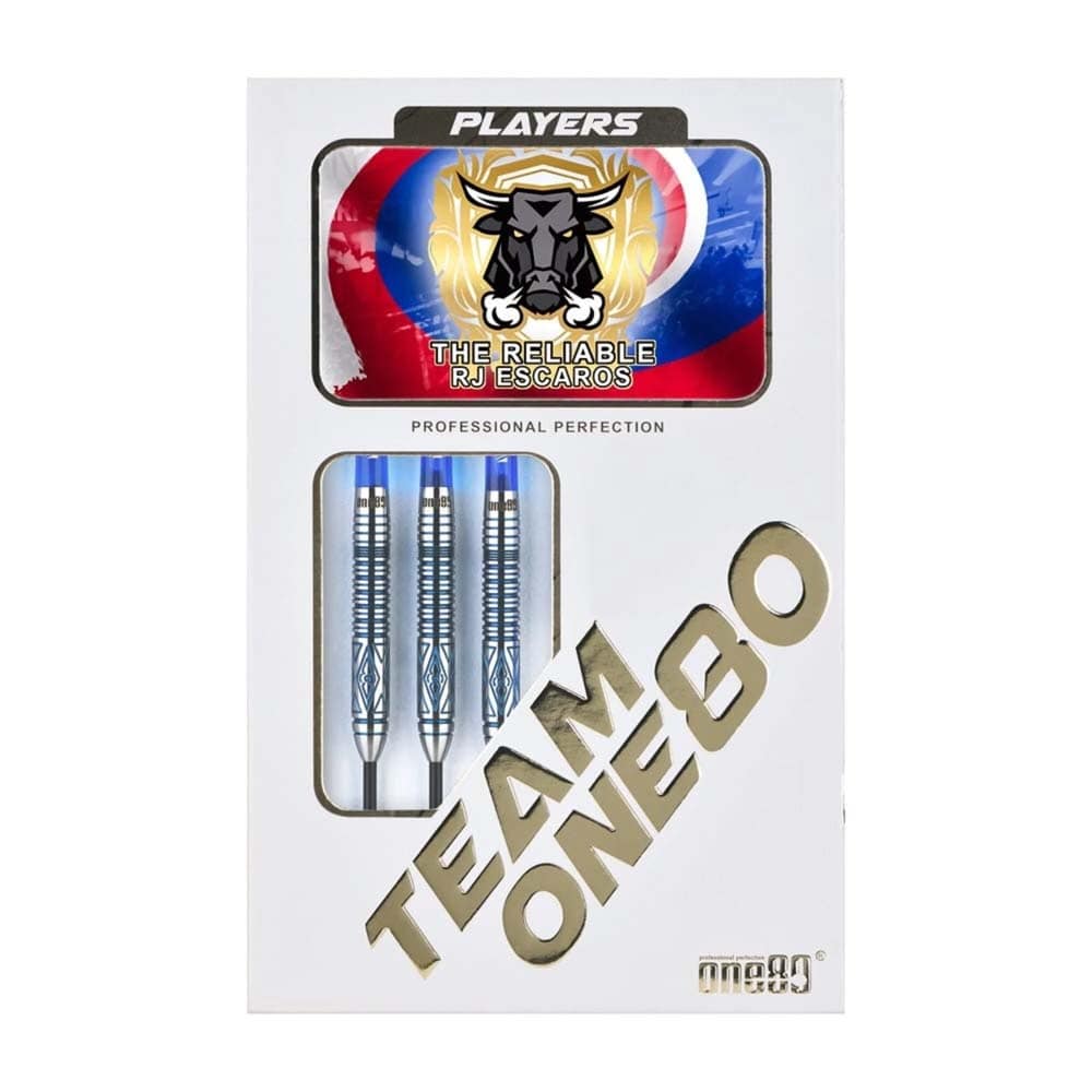 El juego de dardos One80 RJ Escaros se compone por 1 set de 3 cuerpos con punta de acero, 2 sets de 3 cañas y 1 set de 3 plumas.