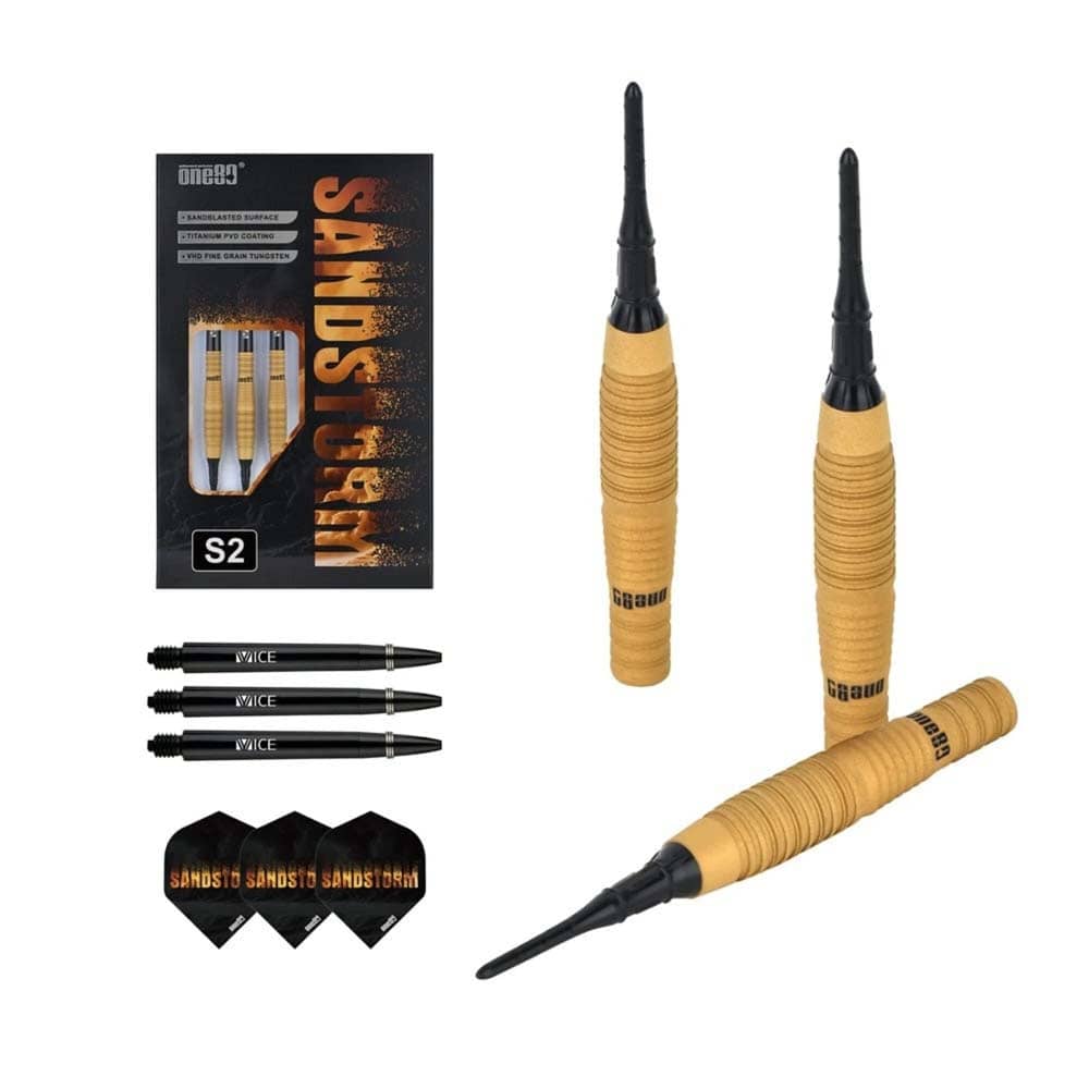 El juego de dardos Sandstorm se compone por 1 set de 3 cuerpos, 1 set de 3 cañas , 1 set de 3 plumas y 1 set de 3 puntas 2ba.