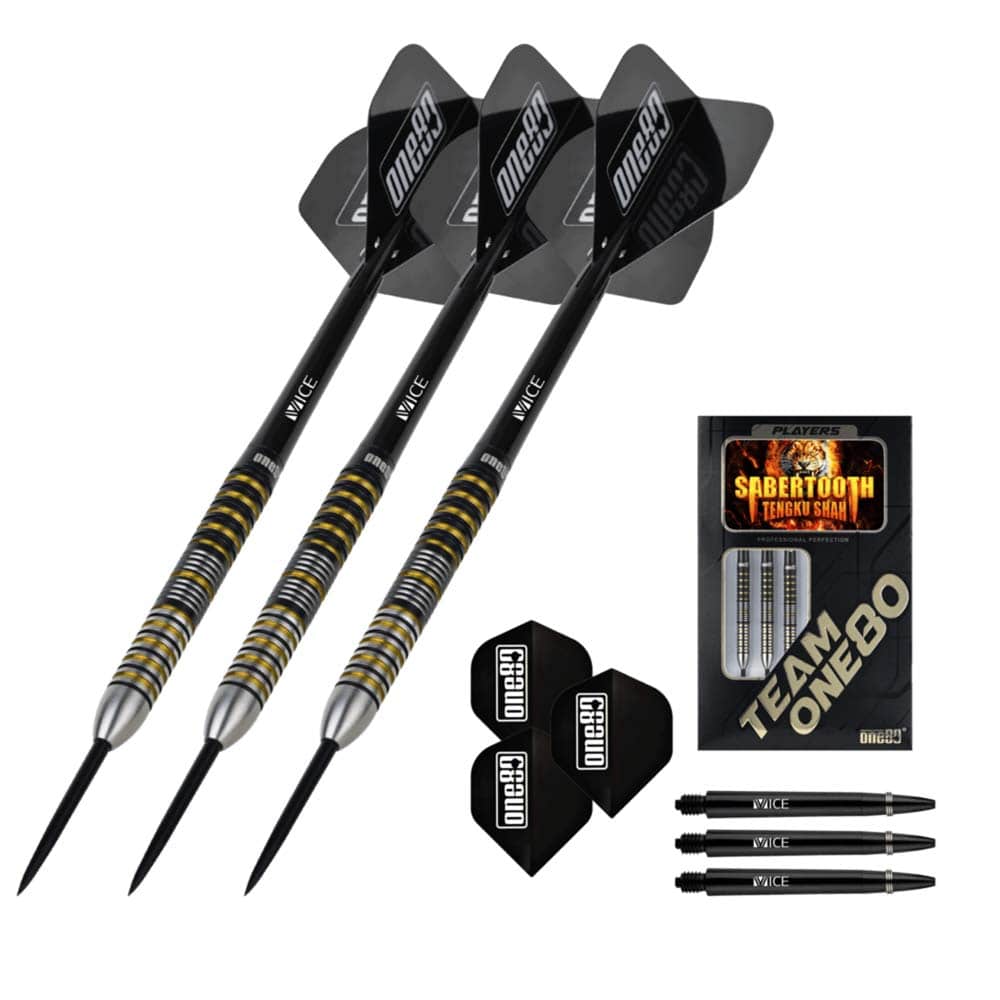 El juego de dardos Tengku Shah Sabertooth se compone por 1 set de 3 cuerpos con punta de acero, 1 set de 3 cañas Vice y 1 set de 3 plumas.