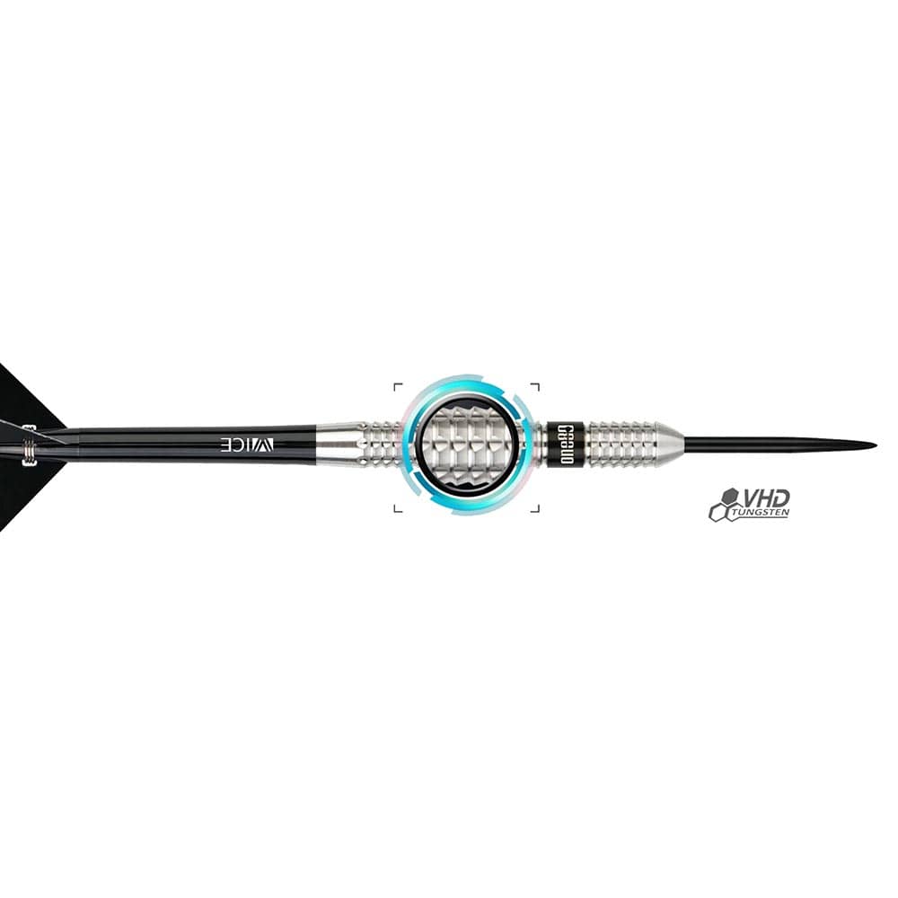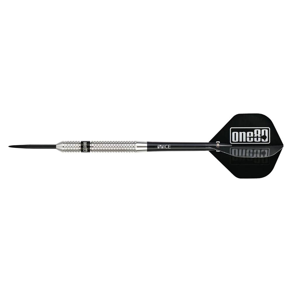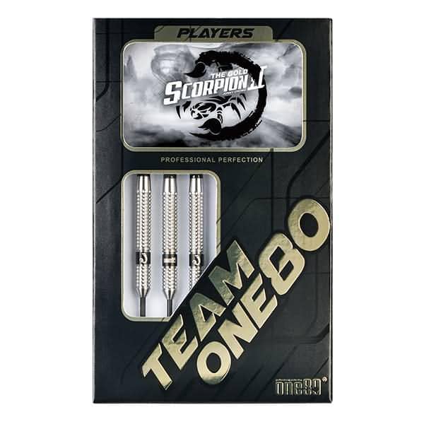 El juego de dardos The Gold Scorpion II Jonny Chong se compone por 1 set de 3 cuerpos con punta de metal, 2 sets de 3 cañas Vice, 1 set de 3 plumas One80 y 1 protector de puntas