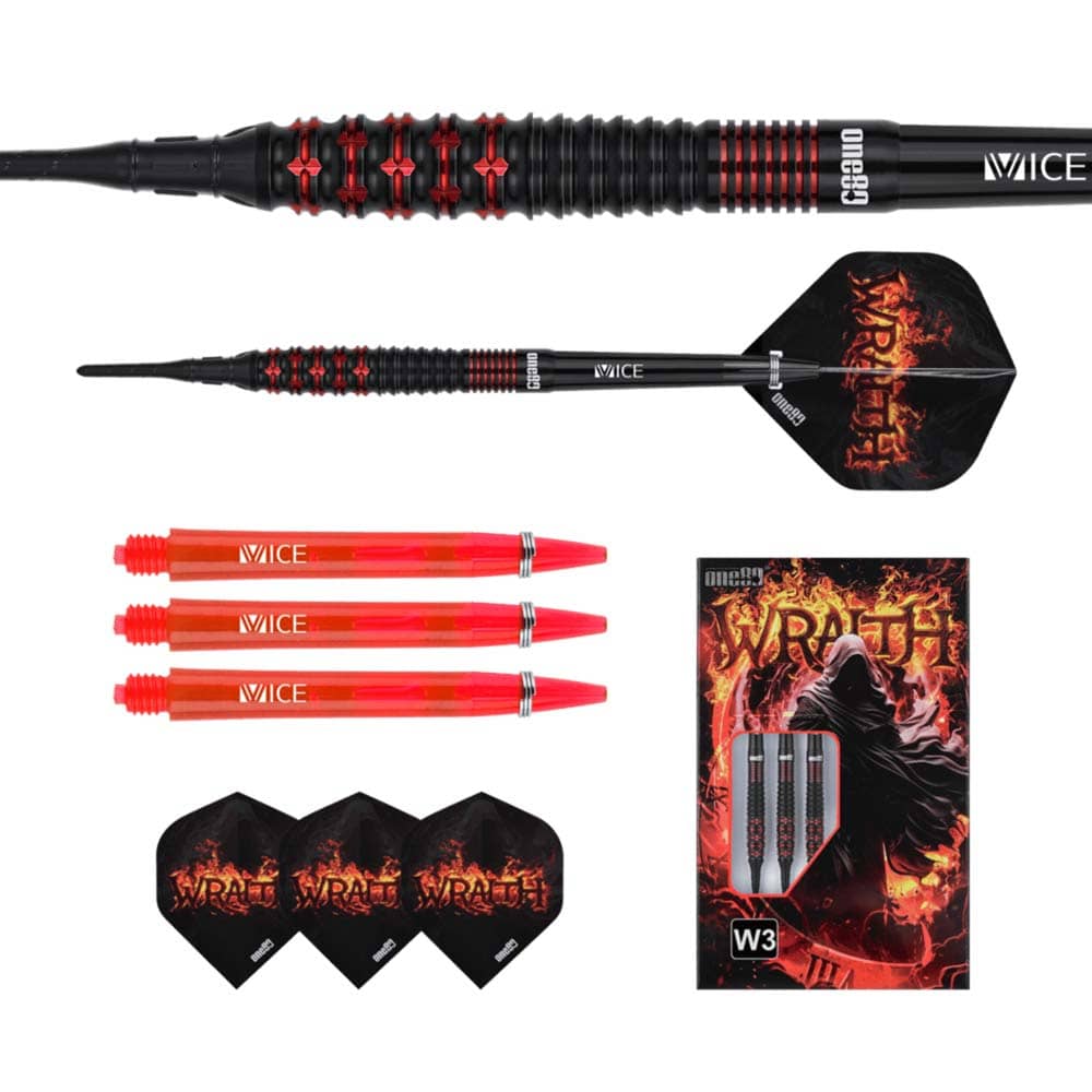 El juego de dardos Wraith W3 se compone por 1 set de 3 cuerpos, 1 set de 3 cañas Vice, 1 set de 3 plumas y 1 set de 3 puntas 2ba.