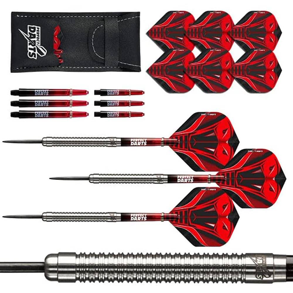 El juego de dardos se compone por 1 set de 3 cuerpos de dardos Dardos Perfect Darts Super Cobra con puntas de acero, 2 sets de 3 cañas Mission y 2 sets de 3 plumas Mission.
