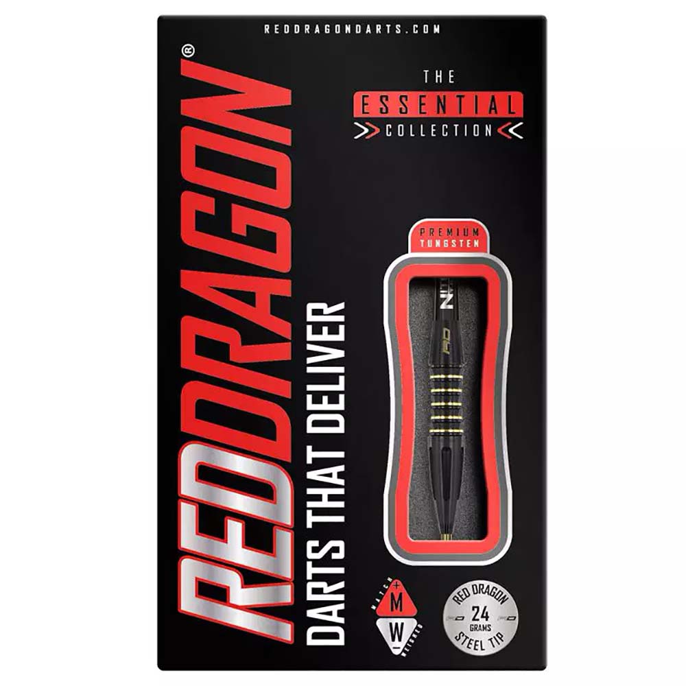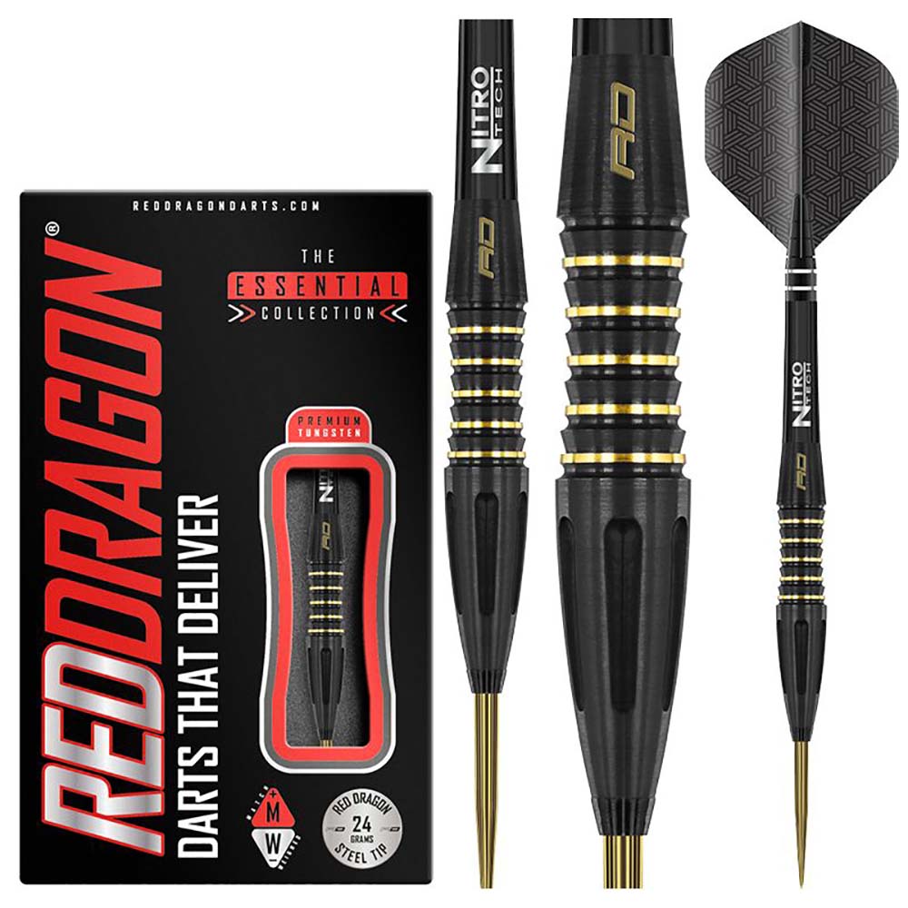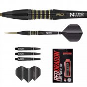 El juego de dardos e compone por 1 set de 3 cuerpos Evoke Red Dragon, 1 set de 3 cañas y 1 set de 3 plumas Red Dragon.
