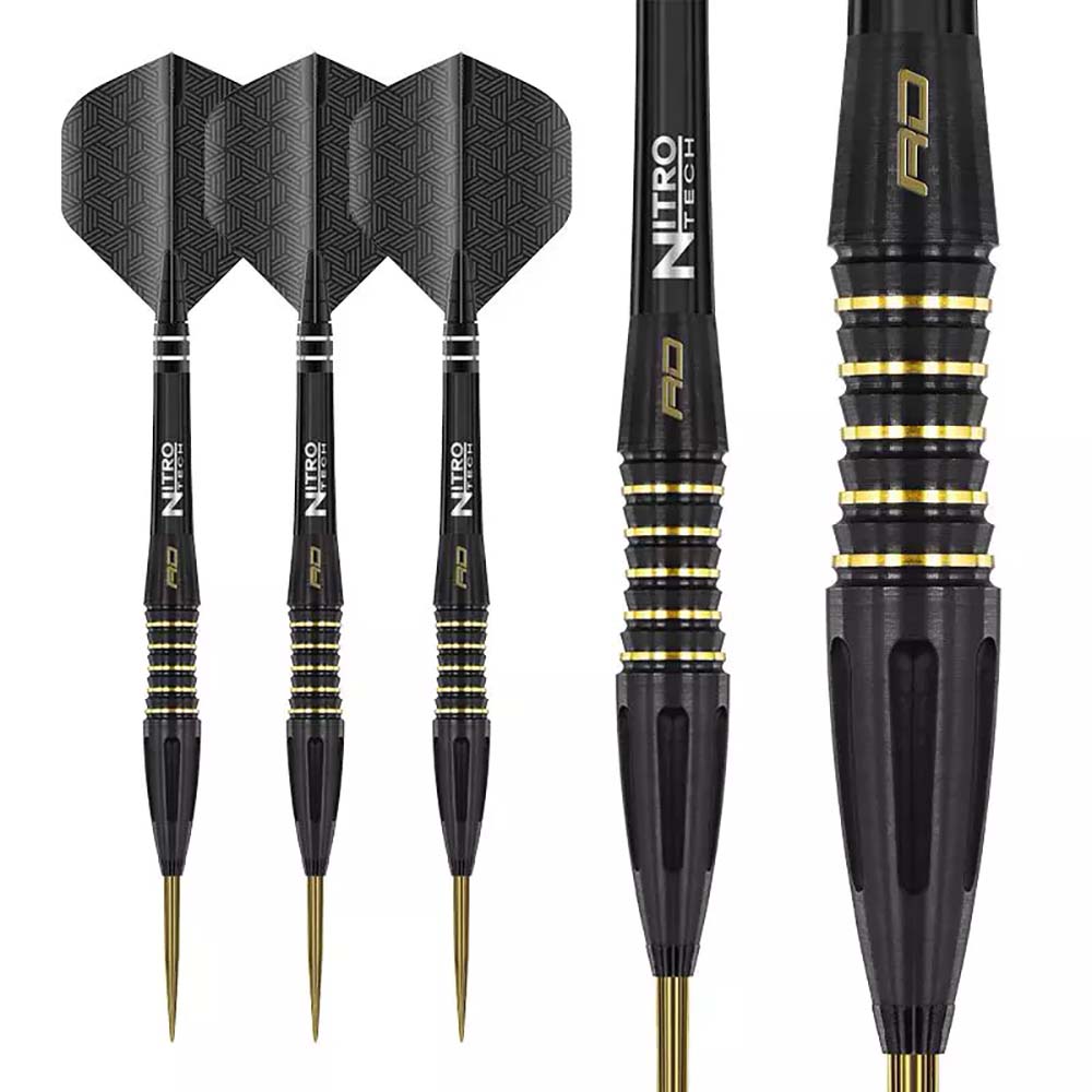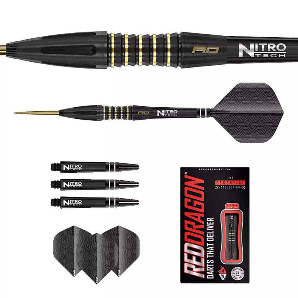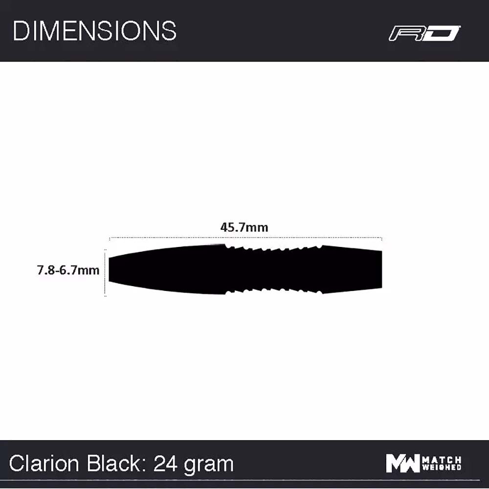 El juego de dardos e compone por 1 set de 3 cuerpos Clarion Black de Red Dragon, 1 set de 3 cañas y 1 set de 3 plumas Red Dragon.