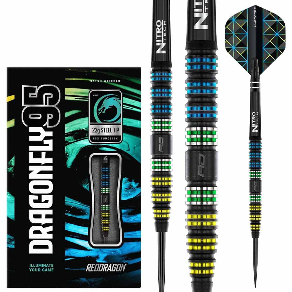 El juego de dardos e compone por 1 set de 3 cuerpos Peter Dragonfly Black Tapered , 1 set de 3 cañas y 1 set de 3 plumas Red Dragon.