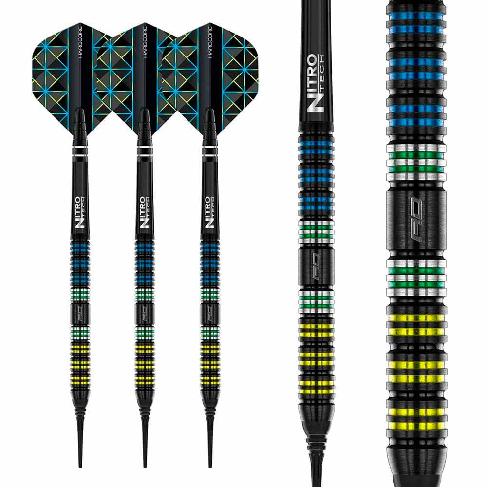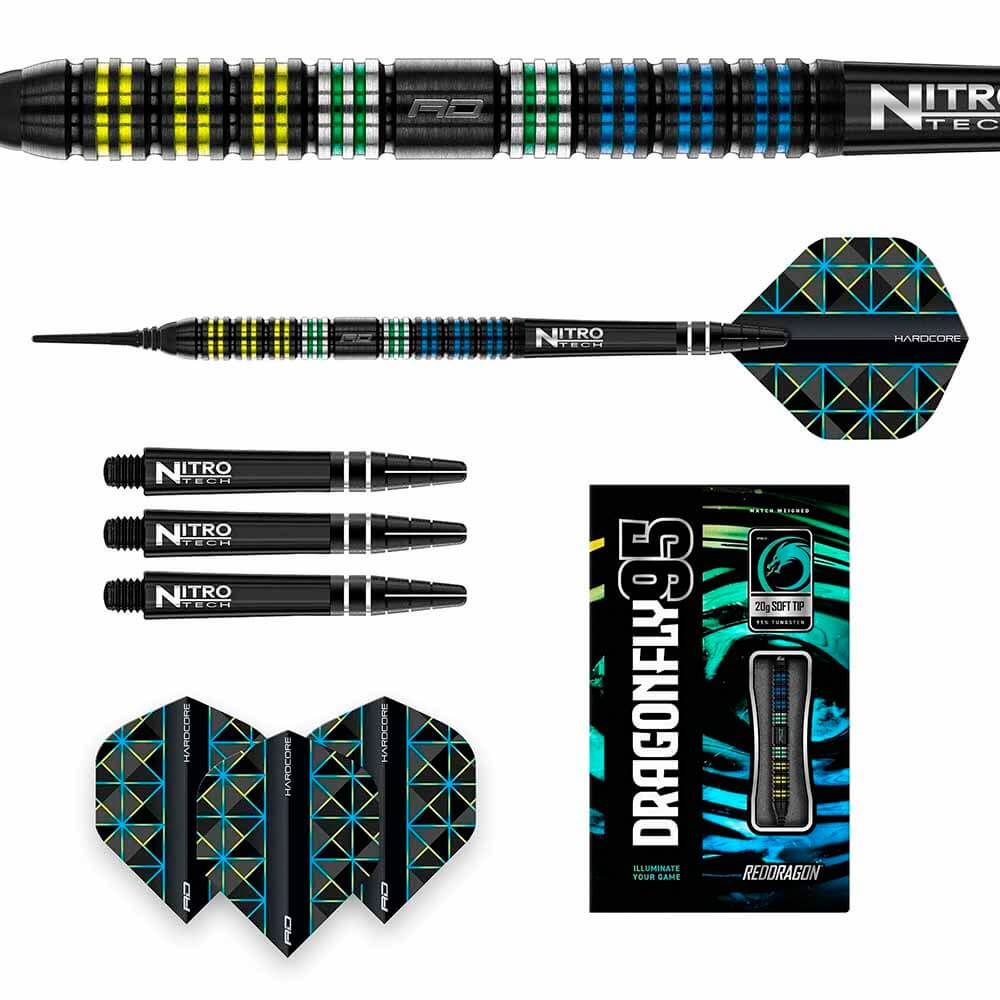El juego de dardos e compone por 1 set de 3 cuerpos Dragonfly Parallel, 1 set de 3 cañas ,1 set de 3 plumas Red Dragon y 1 set de 3 puntas 2ba