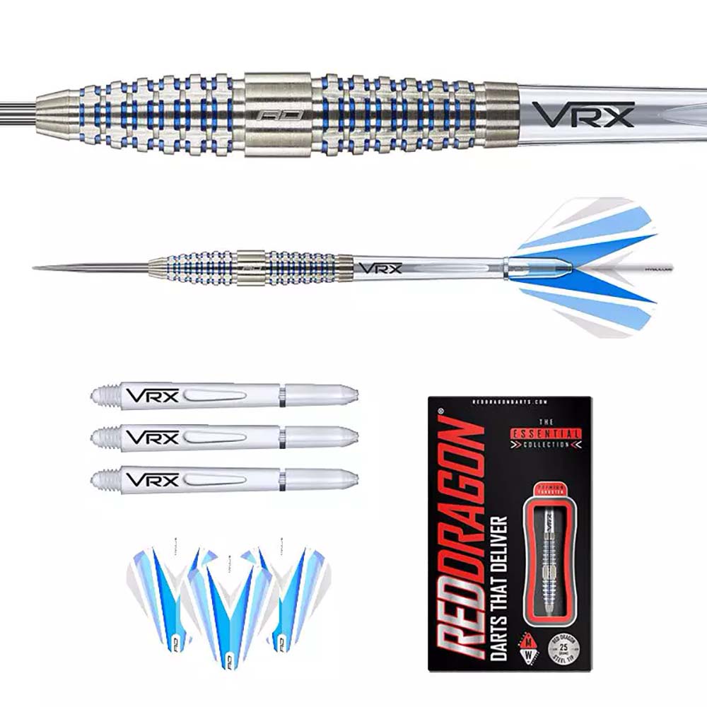El juego de dardos e compone por 1 set de 3 cuerpos Evoke Red Dragon, 1 set de 3 cañas y 1 set de 3 plumas Red Dragon.