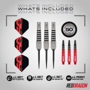 El juego de dardos e compone por 1 set de 3 cuerpos Flightmaster Torpedo 2 con punta de acero, 1 set de 3 cañas y 1 set de 3 plumas Red Dragon
