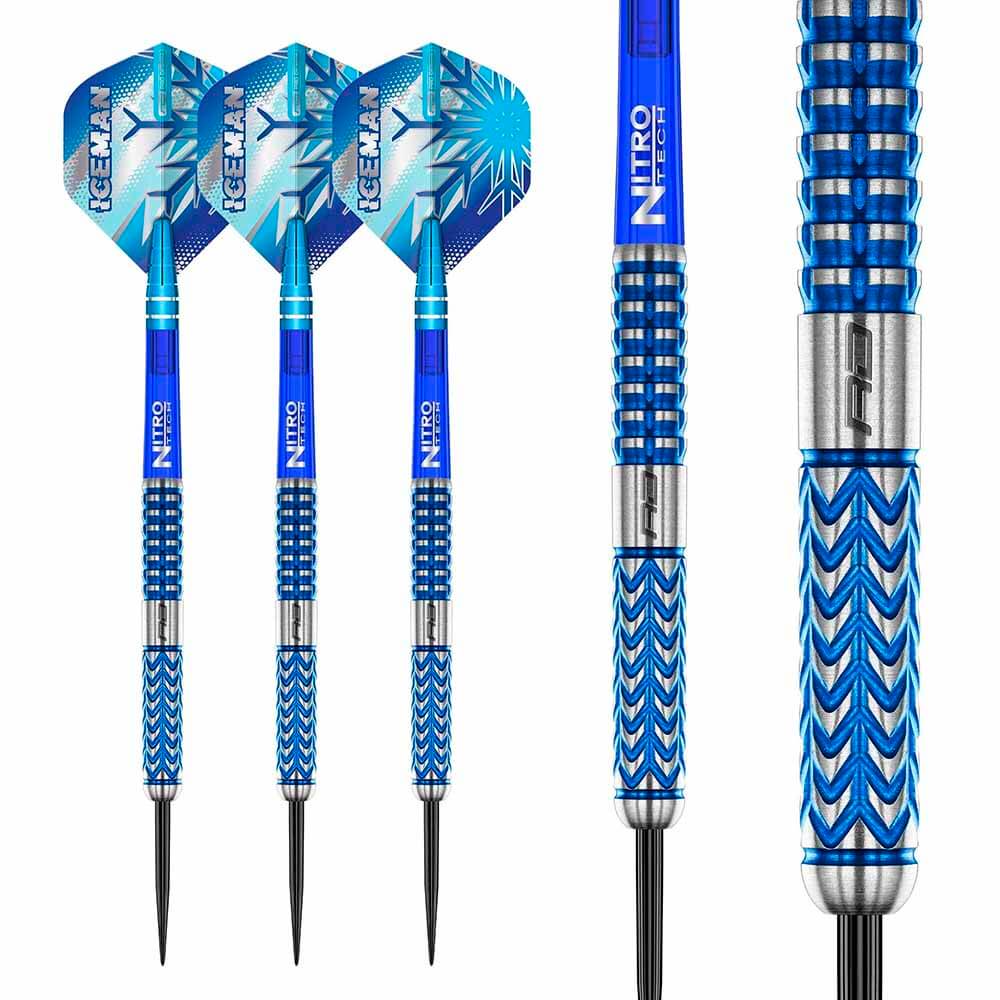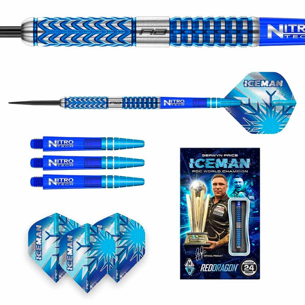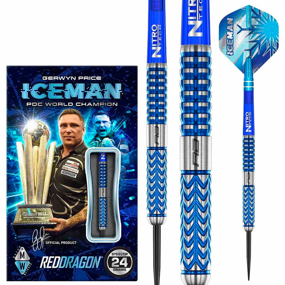 El juego de dardos e compone por 1 set de 3 cuerpos Gerwyn Price Glacier, 1 set de 3 cañas y 1 set de 3 plumas Red Dragon