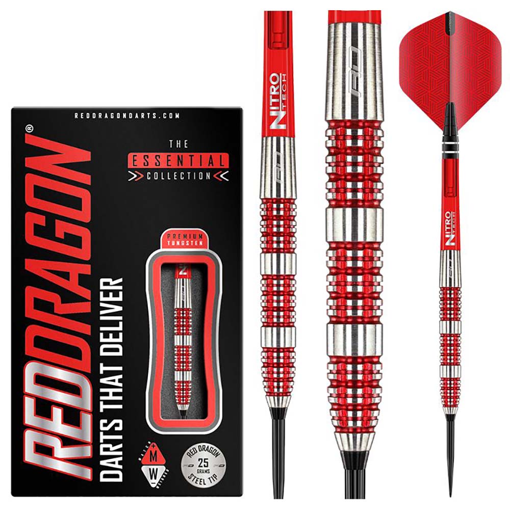 El juego de dardos e compone por 1 set de 3 cuerpos Evoke Red Dragon, 1 set de 3 cañas y 1 set de 3 plumas Red Dragon.