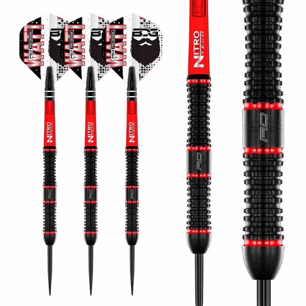 El juego de dardos e compone por 1 set de 3 cuerpos Jason Watt, 1 set de 3 cañas , 1 set de 3 plumas Red Dragon y 1 set de 3 punta 2ba