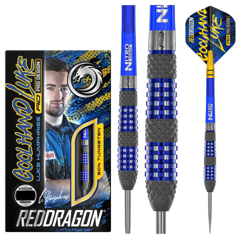 El juego de dardos e compone por 1 set de 3 cuerpos Luke Humphies TX2 Atomised 90% , 1 set de 3 cañas y 1 set de 3 plumas Red Dragon.