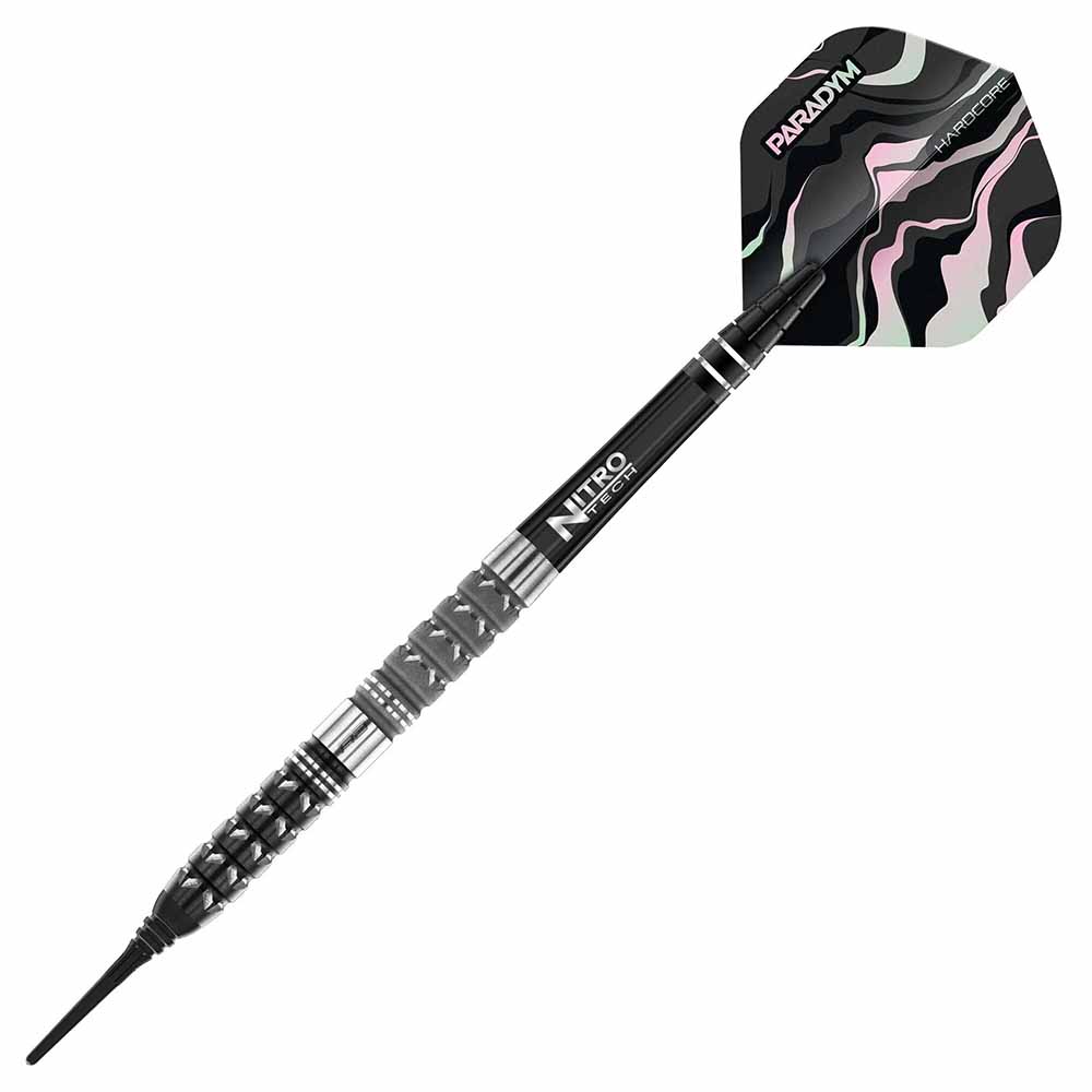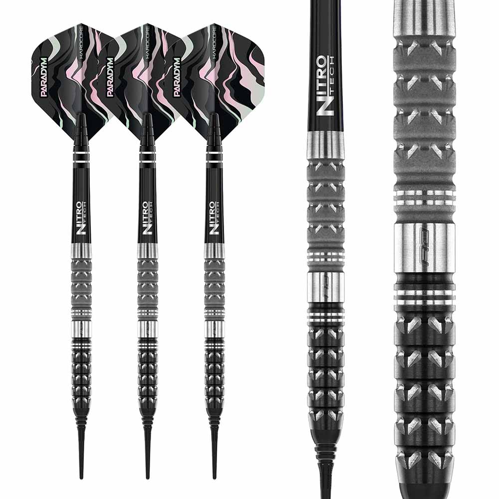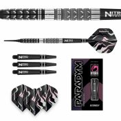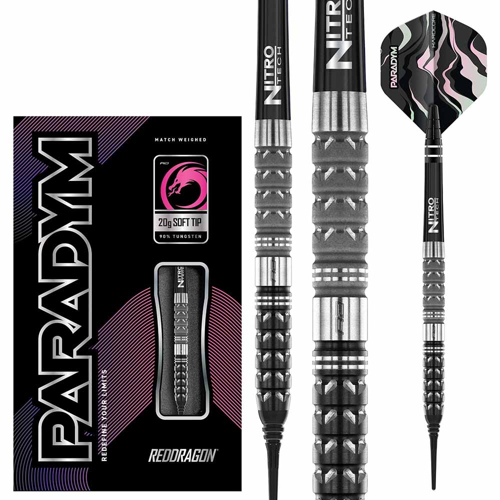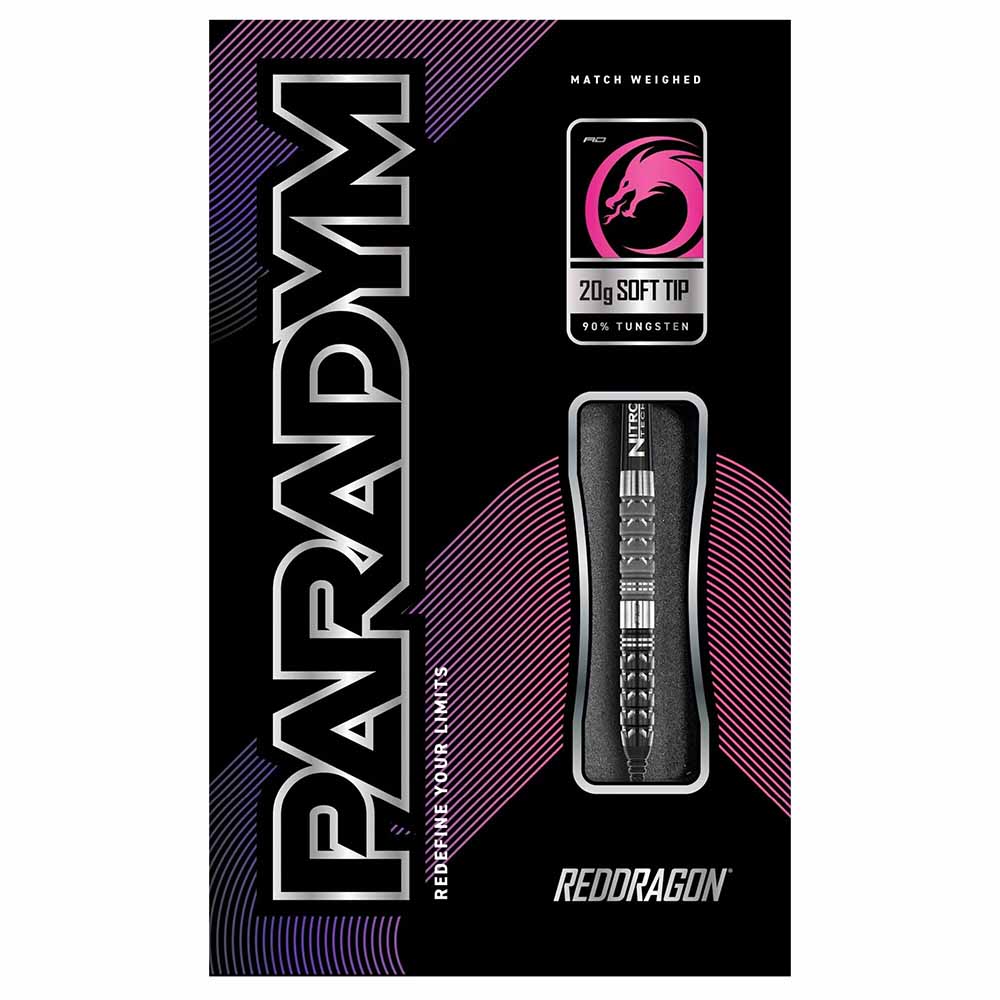 El juego de dardos e compone por 1 set de 3 cuerpos Paradym Tapered, 1 set de 3 cañas y 1 set de 3 plumas Red Dragon.