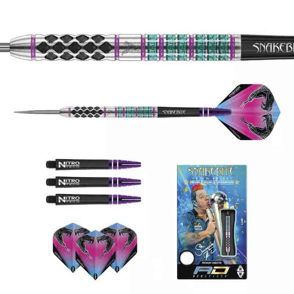 El juego de dardos e compone por 1 set de 3 cuerpos Peter Peter Wright Supa Venom 90% , 1 set de 3 cañas y 1 set de 3 plumas Red Dragon.