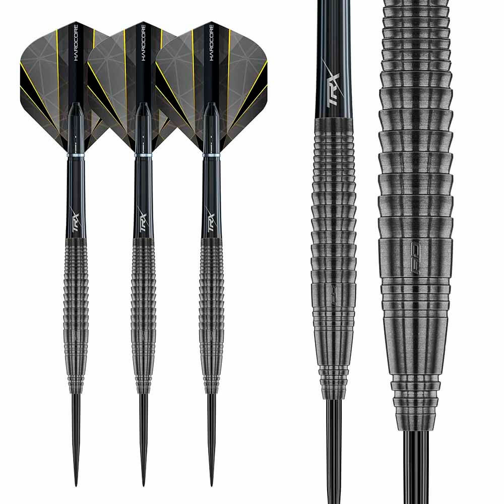 El juego de dardos e compone por 1 set de 3 cuerpos Onyx 4, 1 set de 3 cañas y 1 set de 3 plumas Red Dragon