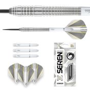 El juego de dardos se compone por 1 set de 3 cuerpos Seren Pure con punta de acero, 1 set de 3 cañas y 1 set de 3 plumas Red Dragon