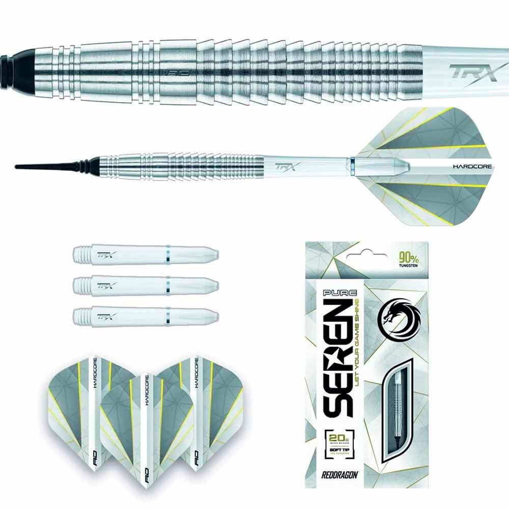 El juego de dardos e compone por 1 set de 3 cuerpos Seren Pure, 1 set de 3 cañas ,1 set de 3 plumas Red Dragon y 1 set de 3 puntas 2ba