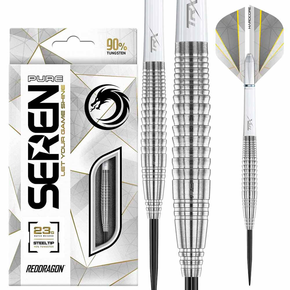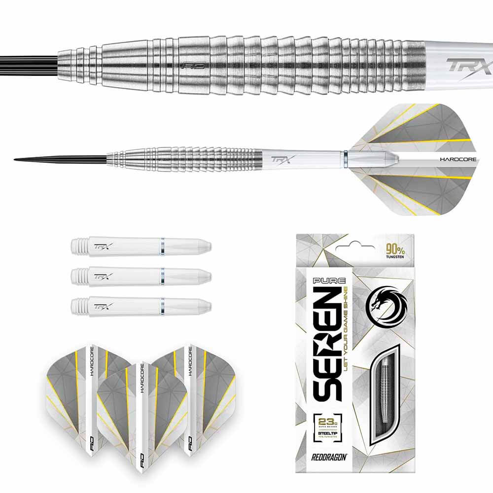 El juego de dardos e compone por 1 set de 3 cuerpos Seren Pure, 1 set de 3 cañas ,1 set de 3 plumas Red Dragon y 1 set de 3 puntas 2ba