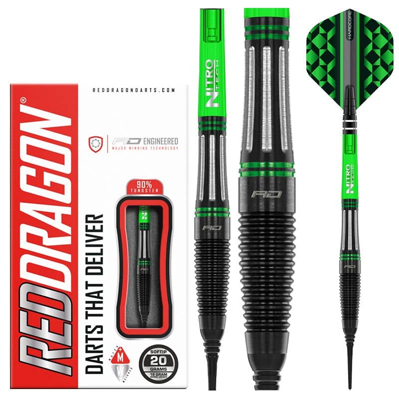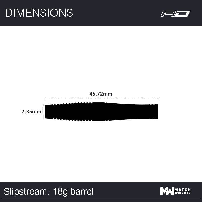 El juego de dardos se compone por 1 set de 3 cuerpos Red Dragon Slipstream, 1 set de 3 cañas, 1 set de 3 plumas Red Dragon y 3 puntas de plástico rosca 2ba.