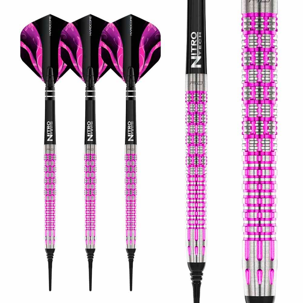 El juego de dardos e compone por 1 set de 3 cuerpos Tyrian Purple, 1 set de 3 cañas ,1 set de 3 plumas Red Dragon y 1 set de 3 puntas 2ba