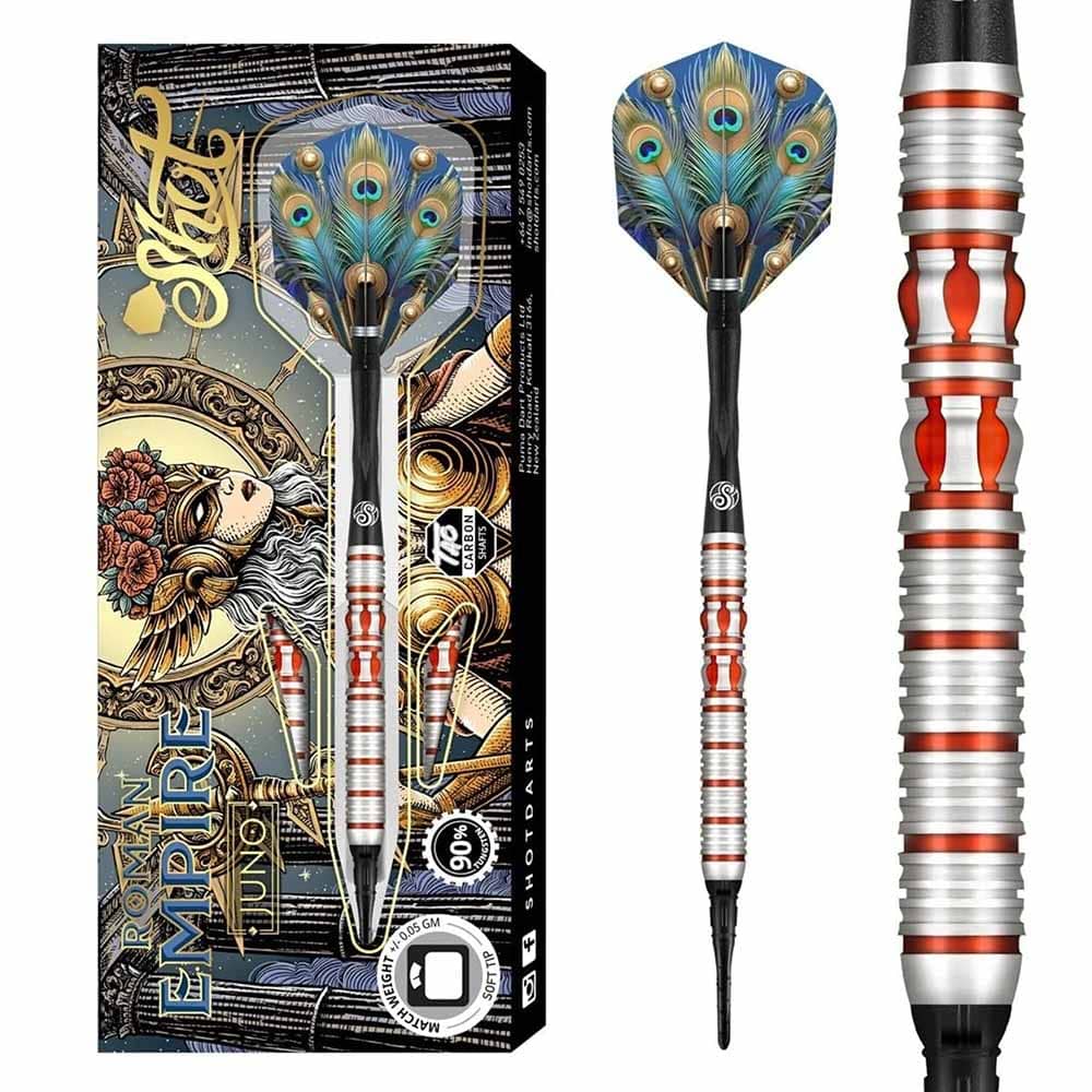 El dardos se compone por 1 ser de 3 cuerpos Celt Juno 90%, 1 ser de 3 cañas ,1 set de 3 plumas y 1 set de 3 puntas 2ba 4mm