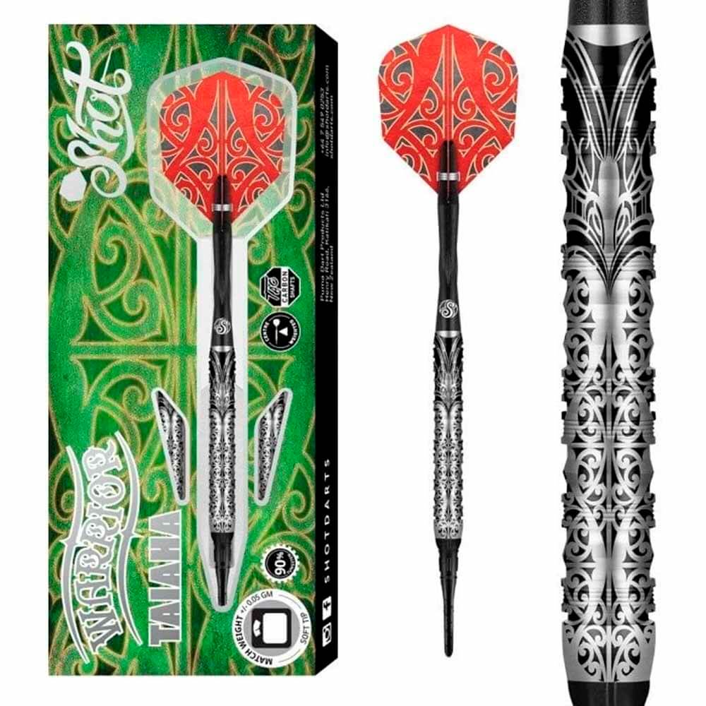 El juego de dardos se compone por 1 set de 3 cuerpos Taiaha Shot, 1 set de 3 cañas , 1 set de 3 plumas y 3 puntas de plástico