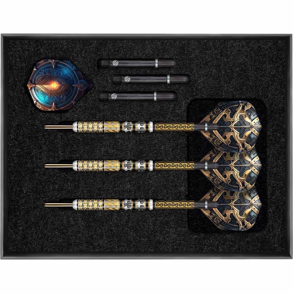 El juego de dardos se compone por 1 set de 3 cuerpos Odin Shot, 1 set de 3 cañas y 1 set de 3 pluma