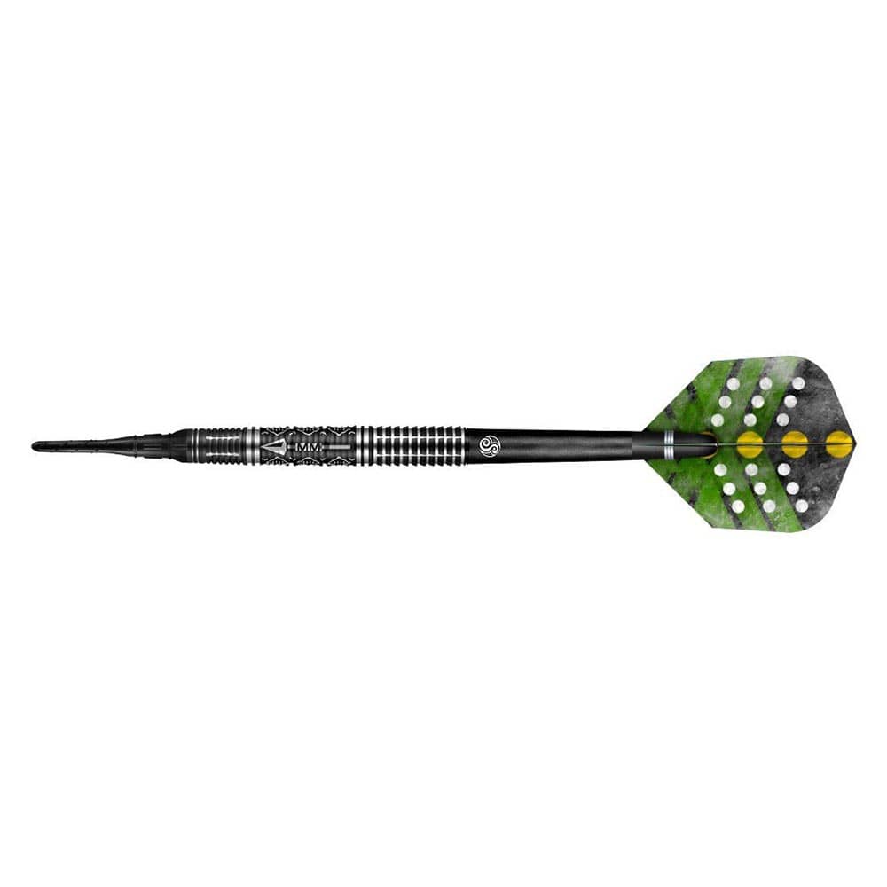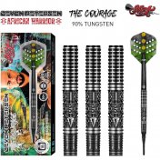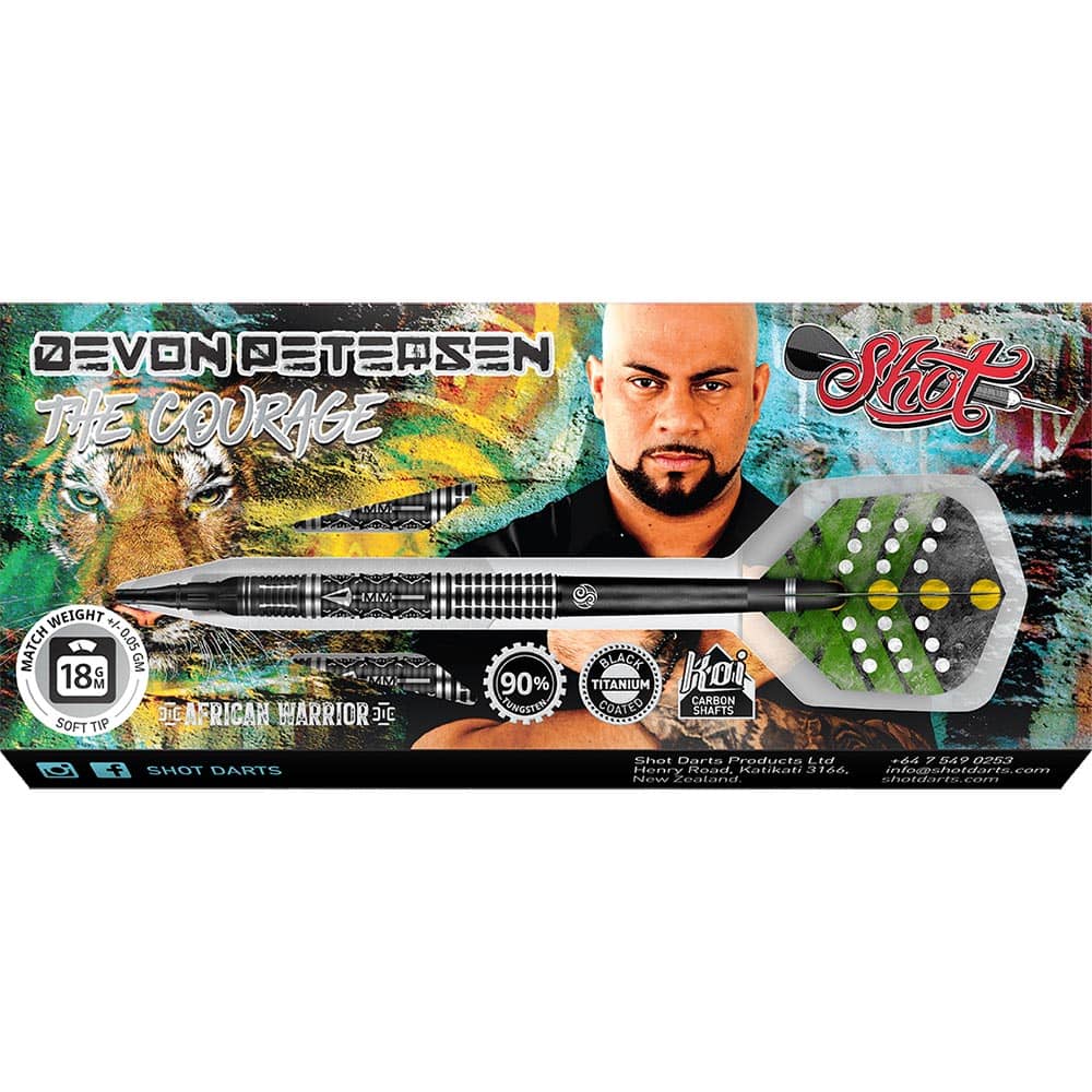El dardos se compone por 1 ser de 3 cuerpos Shot Devon Petersen The Courage, 1 set de 3 cañas Shot Carbon Koi, 1 set de 3 plumas Shot Courage y 3 puntas de plástico 2ba Lippoint Premium negra.